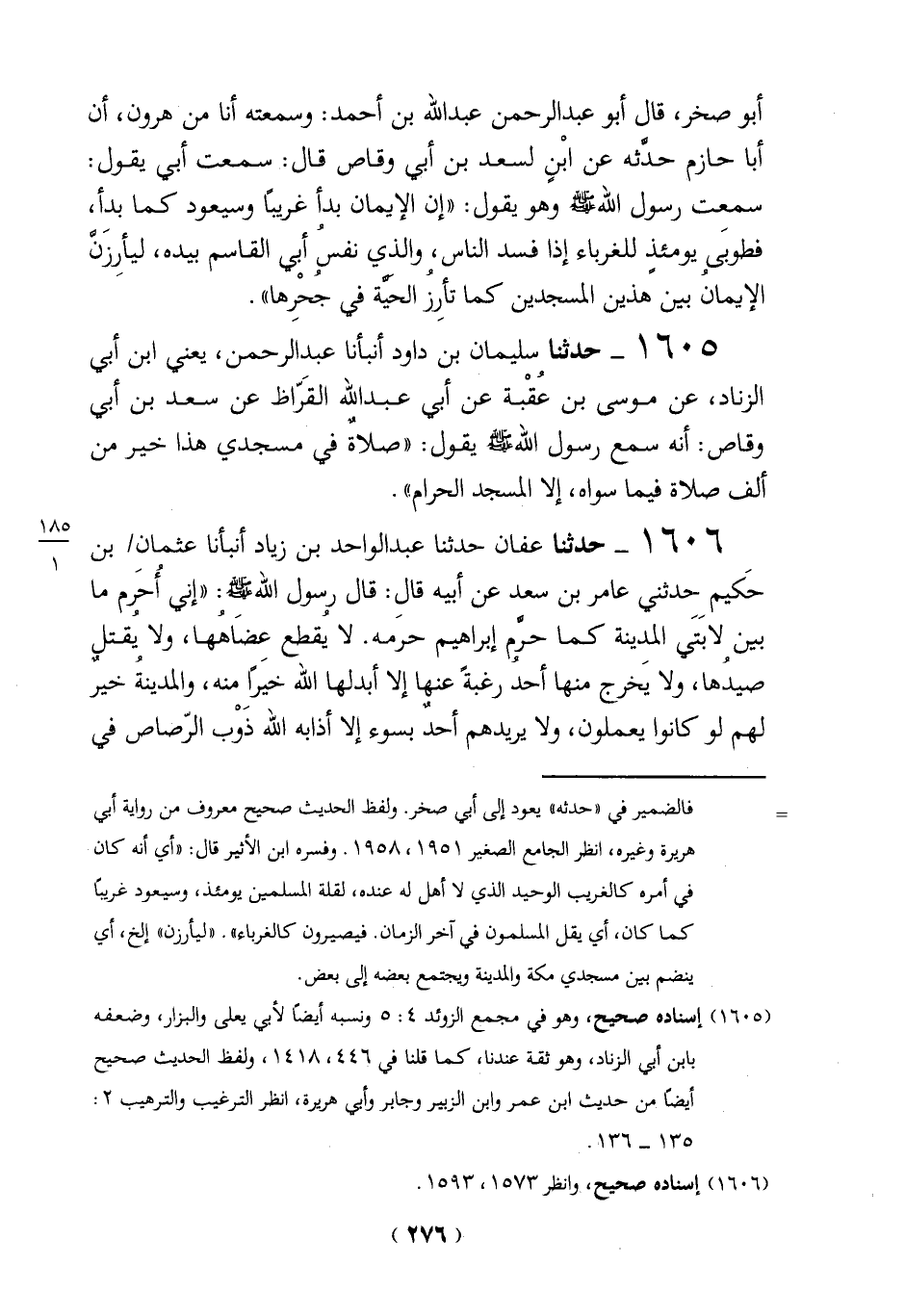 1605 - حدثنا سليمان بن داود أنبأنا عبد الرحمن، يعني ابن أبي الزناد، عن موسى بن عُقْبة عن أبي عبد الله القَرّاظ عن سعد بن أبي وقاص: أنه سمع رسول الله - صلى الله عليه وسلم - يقول: "صلاةٌ في مسجدي هذا خير من ألف صلاة فيما سواه، إلا المسجد الحرام".