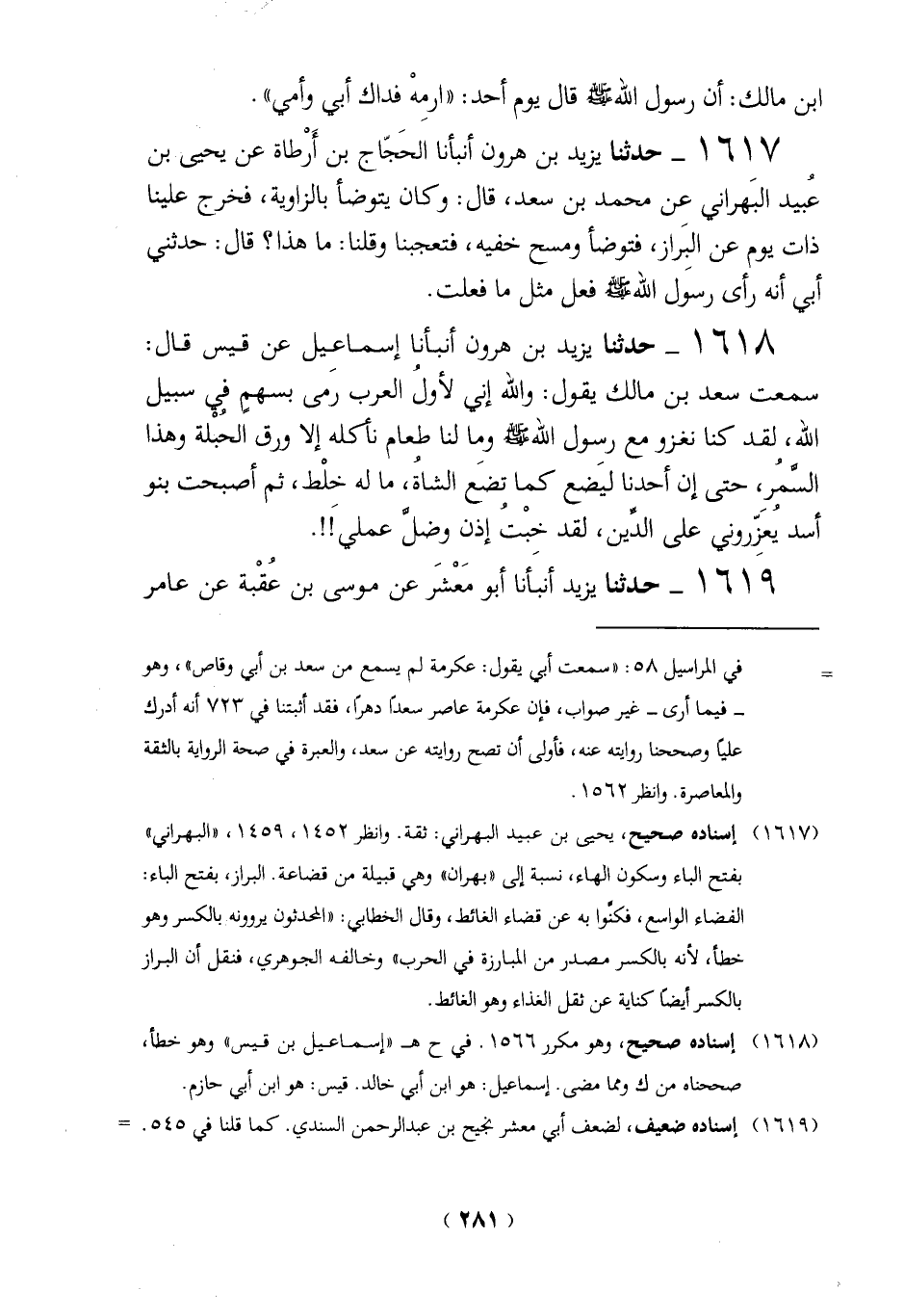 (1618) إسناده صحيح، وهو مكرر 1566. في ح هـ "إسماعيل بن قيس" وهو خطأ، صحناه من ك ومما مضى. إسماعيل: هو ابن أبي خالد. قيس: هو ابن أبي حازم.