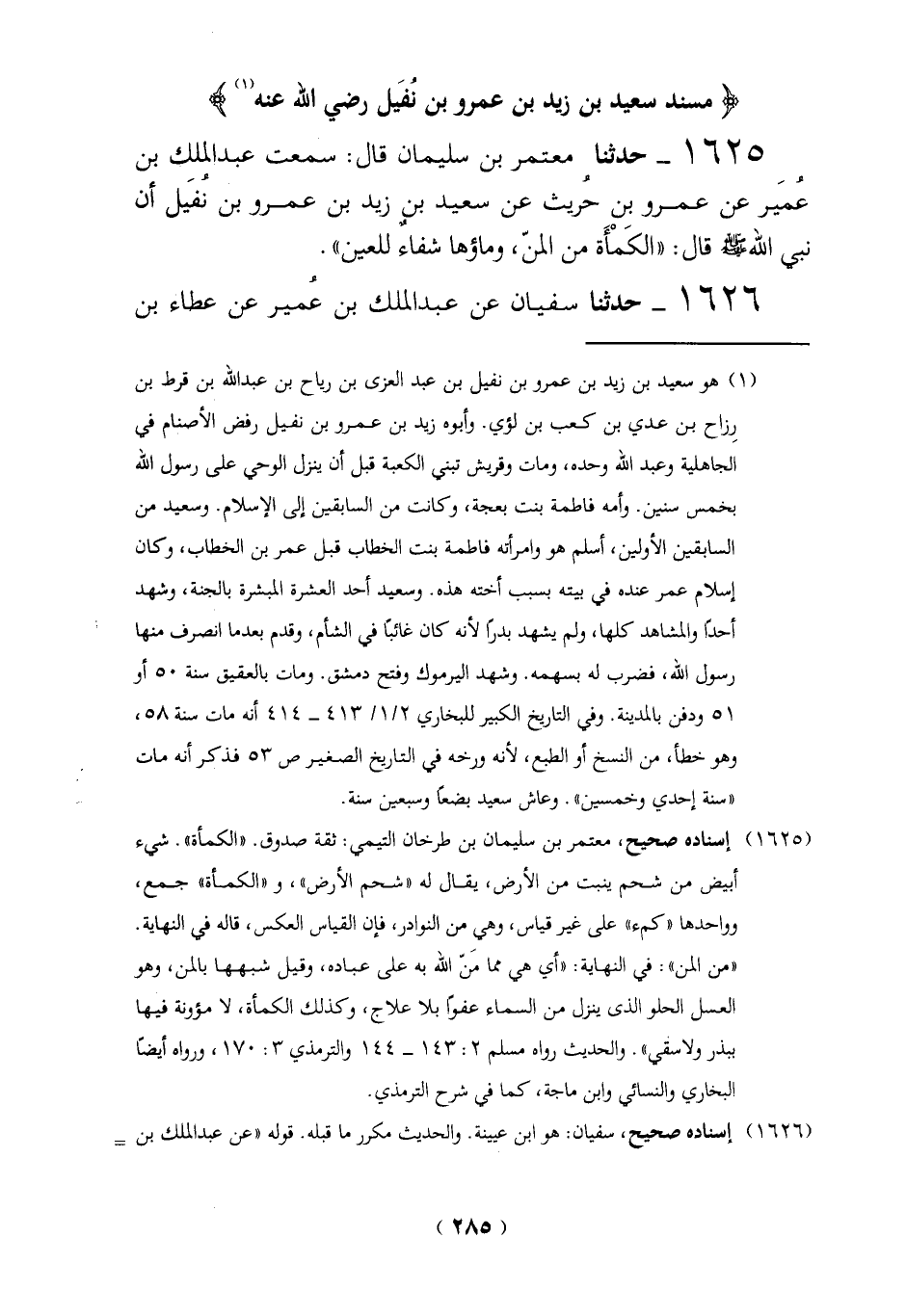 (1625) إسناده صحيح، معتمر بن سليمان بن طرخان التيمي: ثقة صدوق. "الكمأة". شيء أبيض من شحم ينبت من الأرض، يقال له "شحم الأرض"، و "الكمأة" جمع، وواحدها "كمء" على غير قياس، وهي من النوادر، فإن القياس العكس، قاله في النهاية.