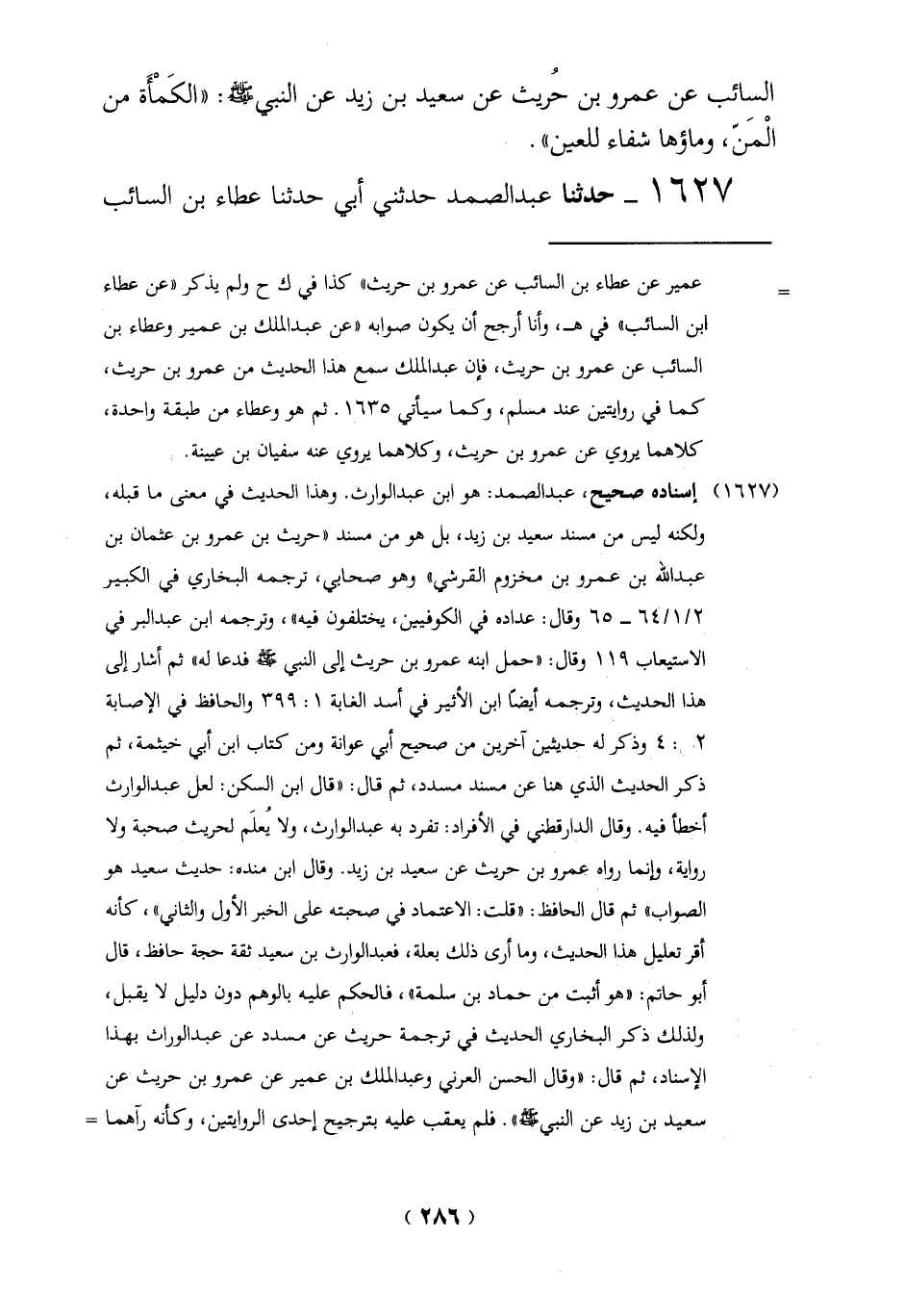 (1627) إسناده صحيح، عبد الصمد: هو ابن عبد الوارث. وهذا الحديث في معنى ما قبله، ولكنه ليس من مسند سعيد بن زيد، بل هو من مسند "حريث بن عمروبن عثمان بن عبد الله بن عمرو بن مخزوم القرشي" وهو صحابي، ترجمه البخاري في الكبير 2/ 1/64 - 65 وقال: عداده في الكوفيين، يختلفون فيه"، وترجمه ابن عبد البر في الاستيعاب 119 وقال: "حمل ابنه عمرو بن حريث إلى النبي - صلى الله عليه وسلم - فدعا له" ثم أشار إلى هذا الحديث، وترجمه أيضاً ابن الأثير في أسد الغابة 1: 399 والحافظ في الإصابة 2.: 4 وذكر له حديثين آخرين من صحيح أبي عوانة ومن كتاب ابن أبي خيثمة، ثم ذكر الحديث الذي هنا عن مسند مسدد، ثم قال: "قال ابن السكن: لعل عبد الوارث أخطأ فيه. وقال الدارقطني في الأفراد: تفرد به عبد الوارث، ولا يُعلَم لحريث صحبة ولا رواية، وإنما رواه عمرو بن حريث عن سعيد بن زيد. وفال ابن منده: حديث سعيد هو الصواب" ثم قال الحافظ: "قلت: الاعتماد في صحبته على الخبر الأول والثاني"، كأنه أقر تعليل هذا الحديث، وما أرى ذلك بعلة، فعبد الوارث بن سعيد ثقة حجة حافظ، قال أبو حاتم:" هو أثبت من حماد بن سلمة"، فالحكم عليه بالوهم دون دليل لا يقبل، ولذلك ذكر البخاري الحديث في ترجمة حريث عن مسدد عن عبد الوراث بهذا الإسناد، ثم قال: "وقال الحسن العرني وعبد الملك بن عمير عن عمرو بن حريث عن سعيد بن زيد عن النبي - صلى الله عليه وسلم -". فلم يعقب عليه بترجيح إحدى الروايتين، وكأنه رآهما =