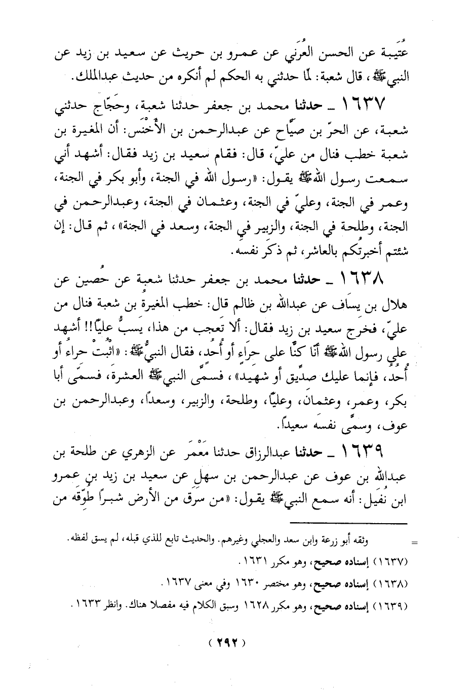 1638 - حدثنا محمد بن جعفرحدثنا شعبة عن حُصين عن هلال بن يِسَاف عن عبد الله بن ظالم قال: خطب المغيرةُ بن شعبة فنال من عليّ، فخرج سعيد بن زيد فقال: ألا تَعجب من هذا، يَسبُّ عليَّا!! أشهد على رسول الله - صلى الله عليه وسلم - أنا كنَّا على حرَاء أو أُحُدِ، فقال النبيُّ - صلى الله عليه وسلم -: "اثبُتْ حراءُ أو أُحُدُ، فإنما عليك صِدِّيق أو شهَيد"، فسَمَّى النبي - صلى الله عليه وسلم - العشرةَ، فسمَّى أبا بكر، وعمر، وعثمان، وعلياً، وطلحة، والزبير، وسعداً، وعبد الرحمن بن