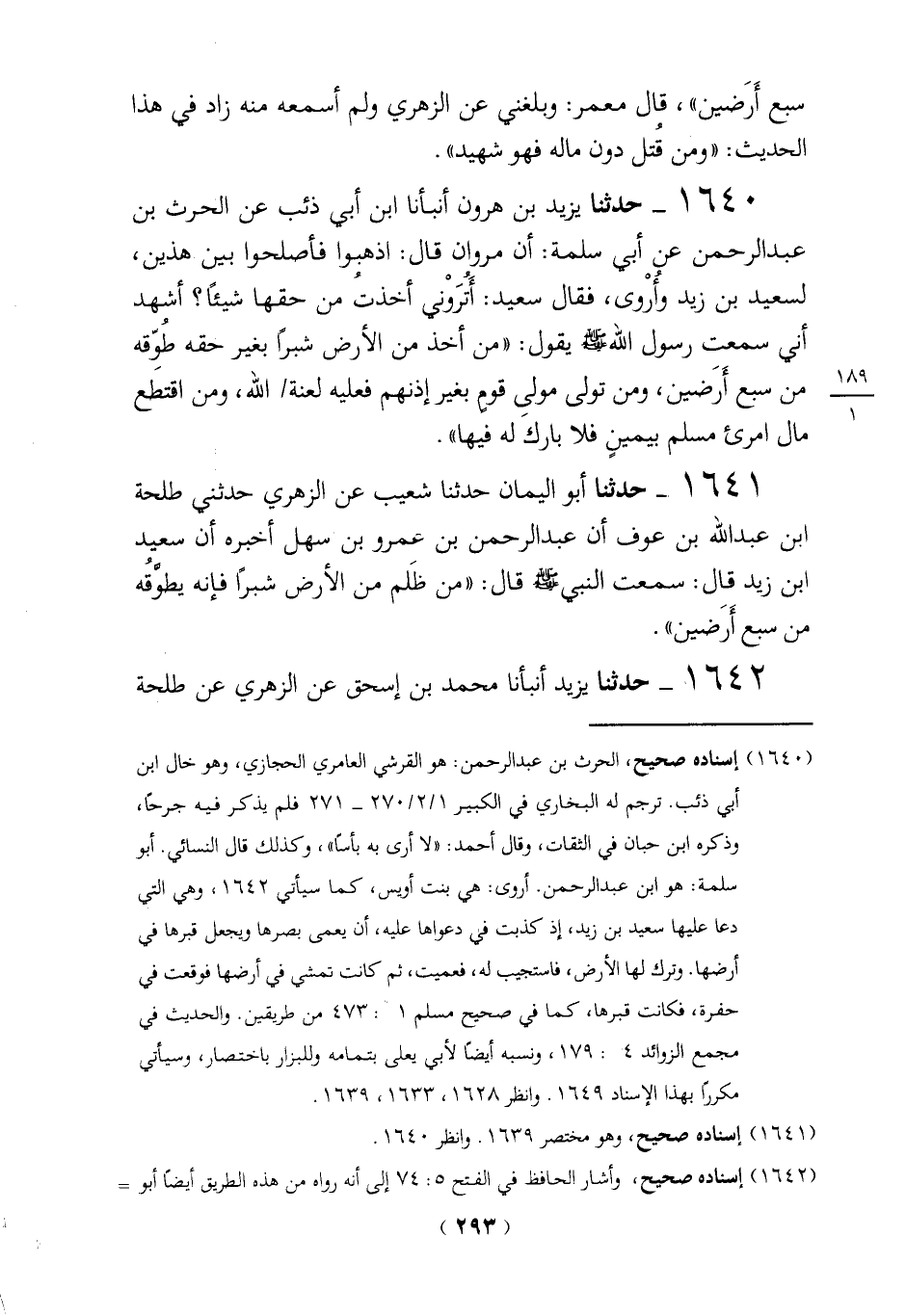 1640 - حدثنا يزيد بن هرون أنبأنا ابن أبي ذئب عن الحرث بن عبد الرحمن عن أبي سلمة: أن مروان قال: اذهبوا فأصلحوا بين هذين، لسعيد بن زيد وأُرْوى، فقال سعيد: أُترَوْني أخذتُ من حقها شيئاً؟ أشهد أنى سمعت رسول الله - صلى الله عليه وسلم - يقول: "من أخذ من الأرض شبرًا بغير حقه طُوِّقه من سبع أَرَضين، ومن تولى مولى قوم بغير إذنهم فعليه لعنة/ الله، ومن اقتطع مال امرئ مسلم بيمينٍ فلا باركَ له فيها".