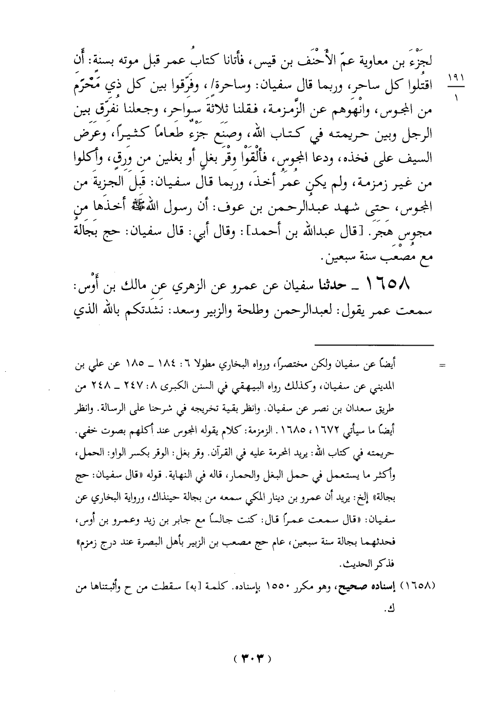 لجزْءَ بن معاوية عم الأحْنَف بن قيس، فأتانا كتابُ عمر قبل موته بسنةٍ: أَنِ اقتلوا كل ساحر، وربما قال سفيان: وساحرة /، وفَرِّقوا بين كل ذيِ مَحْرَم من المجوس، وانْهَوهم عن الزَّمزمة، فقلنا ثلاثةَ سواحر، وجعلنا نُفرق بين الرجل وبين حريمته في كتاب الله، وصَنع حزْءٌ طَعامًا كثيراً، وعَرَض السيف على فخذه، ودعا المجوس، فألْقَوْا وِقْر بغلٍ أو بغلين من وَرِقٍ، وأكلوا من غير زمزمة، ولم يكن عُمَرُ أخذَ، وربما قال سفيان: قَبلَ الجزيةَ من المجوس، حتِىِ شهد عبدُ الرحمن بن عوف: أن رسول الله - صلى الله عليه وسلم - أخذَها من مجوس هَجَرَ. [قال عبد الله بن أحمد]: وقال أبي: قال سفيان: حج بَجَالةُ مع مُصْعَب سنة سبعين.