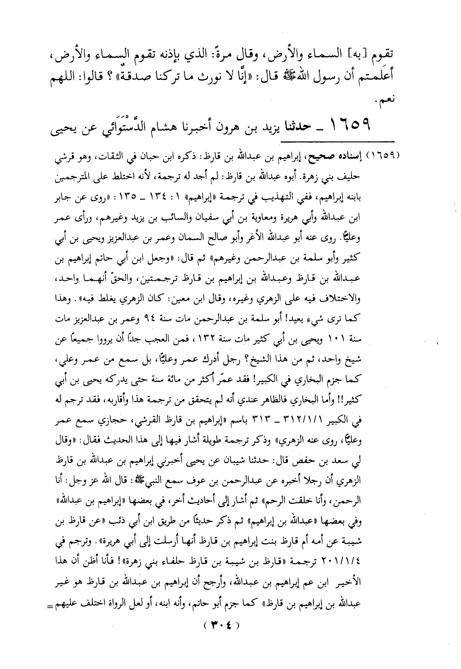 والاختلاف فيه على الزهري وغيره، وقال ابن معين: كان الزهري يغلط فيه". وهذا كما ترى شيء بعيد! أبو سلمة بن عبد الرحمن مات سنة 94 وعمر بن عبد العزيز مات سنة 101 ويحيى بن أبي كثير مات سنة 132، فمن العجب جداً أن يرووا جميعاً عن شيخ واحد، ثم من هذا الشيخ؟ رجل أدرك عمر وعليّا، بل سمع من عمر وعلى، كما جزم البخاري في الكبير! فقد عمر أكثر من مائة سنة حتى يدركه يحيى بن أبي كثير!! وأما البخاري فالظاهر عندي أنه لم يتحقق من ترجمة هذا وأقاربه، فقد ترجم له في الكبير 1/ 1/ 312 - 313 باسم "إبراهيم بن قارظ القرشي، حجازي سمع عمر وعليّاً، روى عنه الزهري" وذكر ترجمة طويلة أشار فيها إلى هذا الحديث فقال: "وقال لي سعد بن حفص قال: حدثنا شيبان عن يحيى أخبرني إبراهيم بن عبد الله بن قارظ الزهري أن رجلا أخبره عن عبد الرحمن بن عوف سمع النبي - صلى الله عليه وسلم -:قال الله عز وجل: أنا الرحمن، وأنا خلقت الرحم "ثم أشار إلى أحاديث أخر، في بعضها "إبراهيم بن عبد الله" وفى بعضها "عبد الله بن إبراهيم" ثم ذكر حديثاً من طريق ابن أبي ذئب "عن قارظ بن شيبة عن أمه أم قارظ بنت إبراهيم بن قارظ أنها أرسلت إلى أبي هريرة". وترجم في 4/ 1/ 201 ترجمة "قارظ بن شيبة بن قارظ حلفاء بني زهرة"! فأنا أظن أن هذا