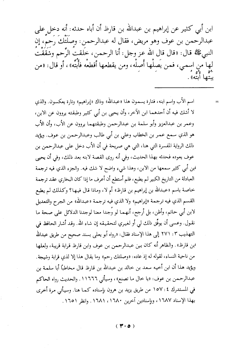= اسم الأب واسم ابنه، فتارة يسمون هذا "عبد الله" وذاك "إبراهيم" وتارة يعكسون. والذي لا أشك فيه أن أحدهما ابن الآخر، وأن يحيى بن أبي كثير وطبقته يروون عن الابن، وعمر بن عبد العزيز وأبو سلمة بن عبد الرحمن وطبقتهما يروون عن الأب، وأن الأب هو الذي سمع عمر بن الخطاب وعلي بن أبي طالب وعبد الرحمن بن عوف. ويؤيد ذلك الرواية المفسرة التي هنا، التي هي صريحة في أن الأب دخل على عبد الرحمن بن عوف يعوده فحدثه بهذا الحديث، وفى أنه روى القصة لابنه بعد ذلك، وفى أن يحيى أبن أبي كثير سمعها من الابن، وهذا شيء واضح لا شك فيه. والجزء الذي فيه ترجمة العبادلة من التاريخ الكبير لم يطبع، فلم أستطع أن أعرف ما إذا كان البخاري عقد ترجمة