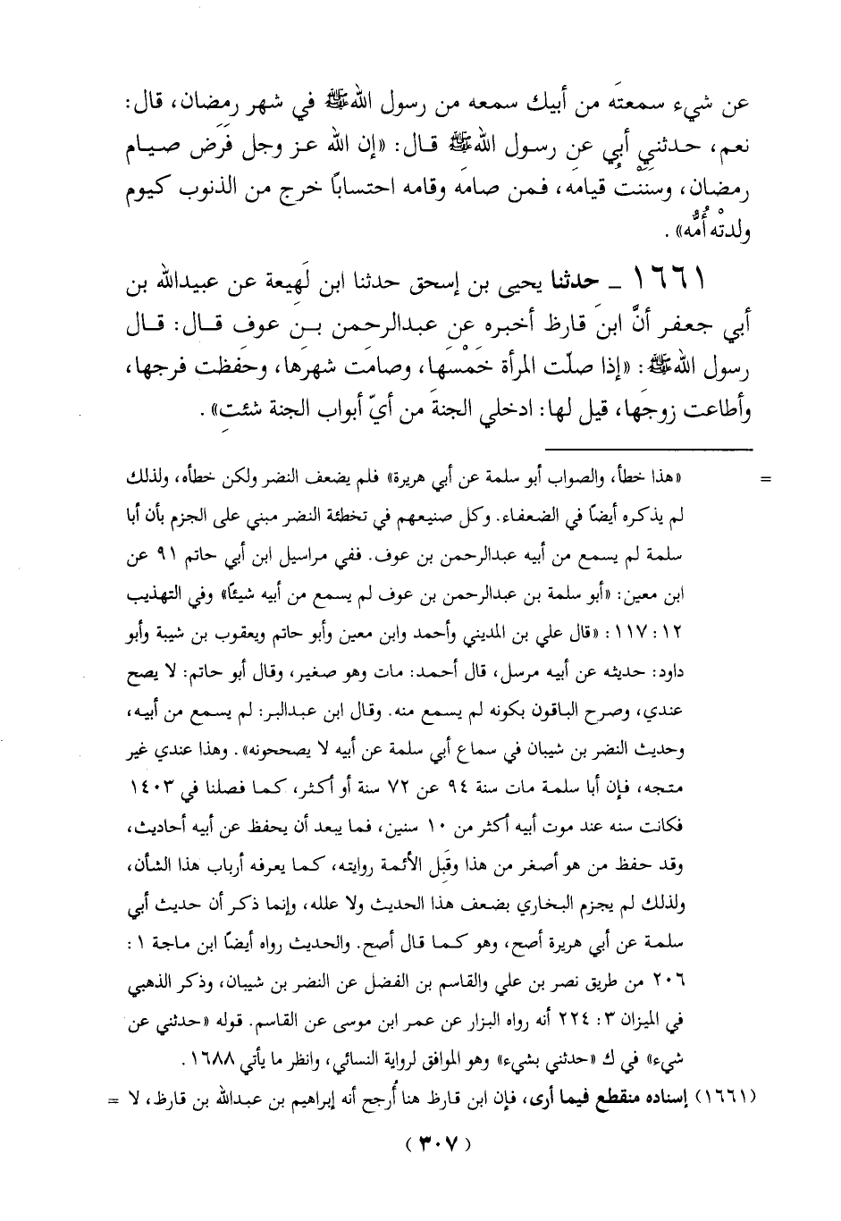= " هذا خطأ، والصواب أبو سلمة عن أبي هريرة" فلم يضعف النضر ولكن خطأه، ولذلك لم يذكره أيضاً في الضعفاء. وكل صنيعهم في تخطئة النضر مبني على الجزم بأن أبا سلمة لم يسمع من أبيه عبد الرحمن بن عوف. ففي مراسيل ابن أبي حاتم 91 عن ابن معين: "أبو سلمة بن عبد الرحمن بن عوف لم يسمع من أبيه شيئَا" وفى التهذيب 12: 117: "قال علي بن المديني وأحمد وابن معين وأبو حاتم ويعقوب بن شيبة وأبو داود: حديثه عن أبيه مرسل، قال أحمد: مات وهو صغير، وقال أبو حاتم: لا يصح عندي، وصرح الباقون بكونه لم يسمع منه. وقال ابن عبد البر: لم يسمع من أبيه، وحديث النضر بن شيبان في سماع أبي سلمة عن أبيه لا يصححونه". وهذا عندي غير متجه، فإن أبا سلمة مات سنة 94 عن 72 سنة أو أكثر، كما فصلنا في 1403 فكانت سنه عند موت أبيه أكثر من 10 سنين، فيما يبعد أن يحفظ عن أبيه أحاديث، وقد حفظ من هو أصغر من هذا وقَبِل الأئمة روايته، كما يعرفه أرباب هذا الشأن، ولذلك لم يجزم البخاري بضعف هذا الحديث ولا علله، وإنما ذكر أن حديث أبي سلمة عن أبي هريرة أصح، وهو كما قال أصح. والحديث رواه أيضا ابن ماجة 1: 206 من طريق نصر بن علي والقاسم بن الفضل عن النضر بن شيبان، وذكر الذهبي في الميزان 3: 224 أنه رواه البزار عن عمر ابن موسى عن القاسم. قوله "حدثني عن شيء" في ك "حدثني بشىء" وهو الموافق لرواية النسائي، وانظر ما يأتي 1688.
