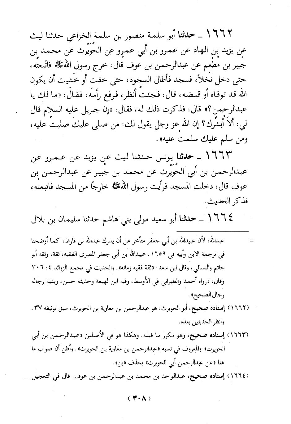 (1663) إسناده صحيح، وهو مكرر ما قبله. وهكذا هو في الأصلين "عبد الرحمن بن أبي الحويرث" والمعروف في نسبه "عبد الرحمن بن معاوية بن الحويرث". وأظن أن صواب ما هنا "عن عبد الرحمن أبي الحويرث" بحذف "بن".