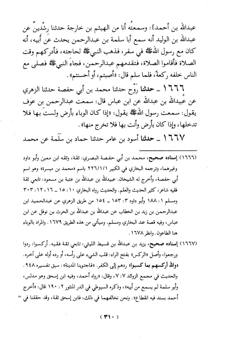 (1666) إسناده صحيح، محمد بن أبي حفصة البصري: ثقة، وثقه ابن معين وأبو داود وغيرهما، وترجمه البخاري في الكبير 1/ 1/ 226 باسم "محمد بن ميسرة" وهو اسم أبي حفصة، وأخرج له الشيخان. عبيد الله بن عبد الله بن عتبة بن مسعود: تابعي ثقة فقيه شاعر، كثير الحديث والعلم. والحديث رواه البخاري 10: 15 - 16، 12: 303 ومسلم1: 188 وأبو داود 3: 153 - 154 من طريق الزهري عن عبد الحميد ابن عبد الرحمن بن زيد بن الخطاب عن عبد الله بن عبد الله بن الحرث بن نوفل عن ابن عباس، وفيه قصة عند البخاري ومسلم. وسيأتي من هذه الطريق 1679. والمراد بالوباء هنا الطاعون. وانظر 1678.