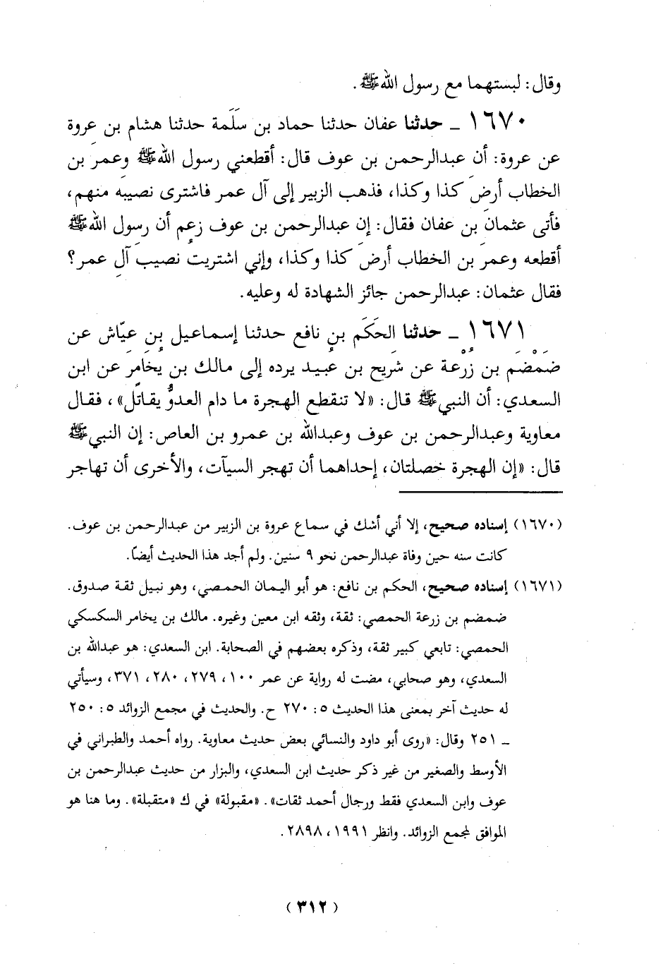 1670 - حدثنا عفان حدثنا حماد بن سَلَمة حدثنا هشام بن عروة عن عروة: أن عبد الرحمن بن عوف قال: أقطعني رسول الله - صلى الله عليه وسلم - وعمرَ بن الخطاب أرضَ كذا وكذا، فذهب الزبير إلى آل عمر فاشترى نصيبَه منهم، فأتى عثمانَ بن عفان فقال: إن عبد الرحمن بن عوف زعم أن رسول الله - صلى الله عليه وسلم - أقطعه وعمرَ بن الخطاب أرضَ كذا وكذا، وإني اشتريتُ نصيبَ آل عمر؟ فقال عثمان: عبد الرحمن جائز الشهادة له وعليه.