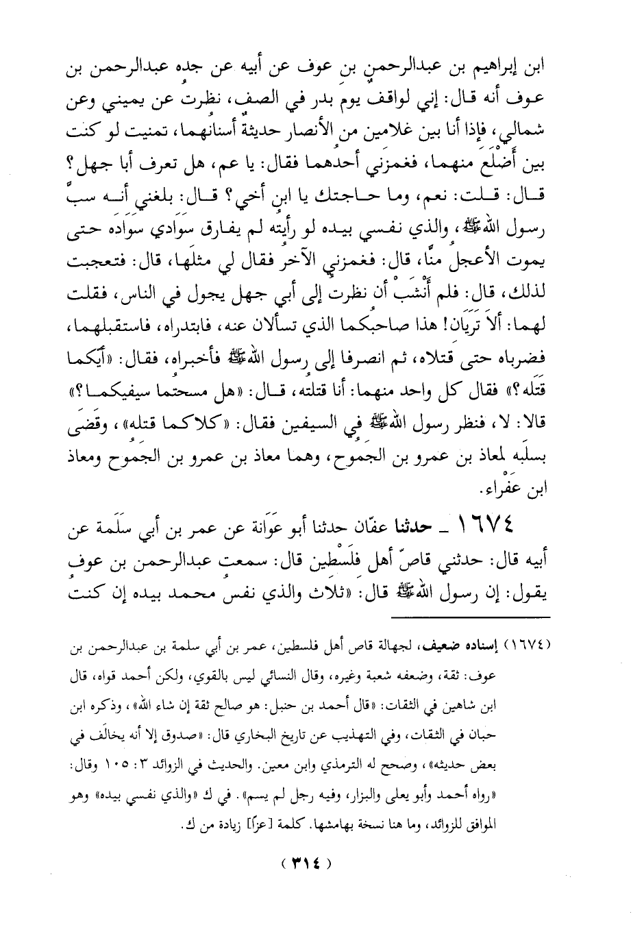 ابن إبراهيم بن عبد الرحمن بنِ عوف عن أبيه عن جده عبد الرحمن بن عوف أنه قال: إني لواقفٌ يوم بدر في الصف، نظرتُ عن يمينى وعن شمالي، فإذا أنا بين غلامين من الأنصار حديثةٌ أسنانهما، تمنيت لو كنت بين أَضْلَعَ منهما، فغمزَني أحدهما فقال: يا عم، هل تعرف أبا جهل؟ قال: قلت: نعم، وما حاجتك يا ابني أخي؟ قال: بلغنيِ أنه سبَّ رسول الله - صلى الله عليه وسلم -، والذي نفسي بيده لو رأيته لم يفارق سَوَادى سوَادَه حتى يموت الأعجلُ منَّا، قال: فغمزني الآخرُ فقال لي مثلَها، قال: فتعجبت لذلك، قالٍ: فلم أَنْشَبْ أن نظرت إلى أبي جهل يجول في الناس، فقلت لهما: ألاَ تريَان! هذا صاحبُكما الذي تسألان عنه، فابتدراه، فاستقبلهما، فضرباه حتى قَتلاه، ثم انصرفا إلى رسول الله - صلى الله عليه وسلم - فأخبراه، فقال: "أيكما قَتَله؟ " فقال كل واحد منهما: أنا قتلتُه، قال: "هل مسحتُما سيفيكما؟ " قالا: لا، فنظر رسول الله - صلى الله عليه وسلم - في السيفين فقال: "كلاكما قتله"، وقَضَى بسلَبه لمعاذ بن عمرو بن الجَمُوح، وهما معاذ بن عمرو بن الجَمُوح ومعاذ ابن عَفْراء. 1674 - حدثنا عفّان حدثنا أبو عَوَانة عن عمر بن أبي سَلَمة عن أبيه قال: حدثني قاصّ أهل فلَسْطين قال: سمعت عبد الرحمن بن عوف يقول: إن رسول الله - صلى الله عليه وسلم - قال: "ثلاَث والذي نفس محمد بيده إن كنتُ