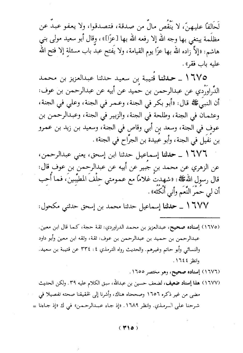 1675 - حدثنا قُتيبة بن سعيد حدثنا عبد العزيز بن محمد الدَّراوَرْدِي عن عبد الرحمن بن حميد عن أبيه عن عبد الرحمن بن عوف: أن النبي - صلى الله عليه وسلم - قال: "أبو بكر في الجنة، وعمر في الجنة، وعلي في الجنة، وعثمان في الجنة، وطلحة في الجنة، والزبير في الجنة، وعبد الرحمن بن عوف في الجنة، وسعد بين أبي وقاص في الجنة، وسعيد بن زيد بن عمرو بن نفَيل في الجنة، وأبو عبيدة بن الجراح في الجنة".