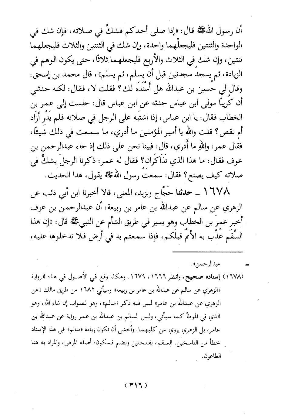 (1678) إسناده صحيح، وانظر 1666، 1679. وهكذا وقع في الأصول في هذه الرواية "الزهري عن سالم عن عبد الله بن عامر بن ربيعة" وسيأتي 1682 من طريق مالك "عن الزهري عن عبد الله بن عامر" ليس فيه ذكر "سالم"، وهو الصواب إن شاء الله، وهو الذي في الموطأ كما سيأتي، وليس لسالم بن عبد الله بن عمر رواية عن عبد الله بن عامر، بل الزهري يروي عن كليهما. وأخشى أن تكون زيادة "سالم" في هذا الإسناد خطأ من الناسخين. السقم، بفتحتين وبضم فسكون: أصله المرض، والمراد به هنا الطاعون.