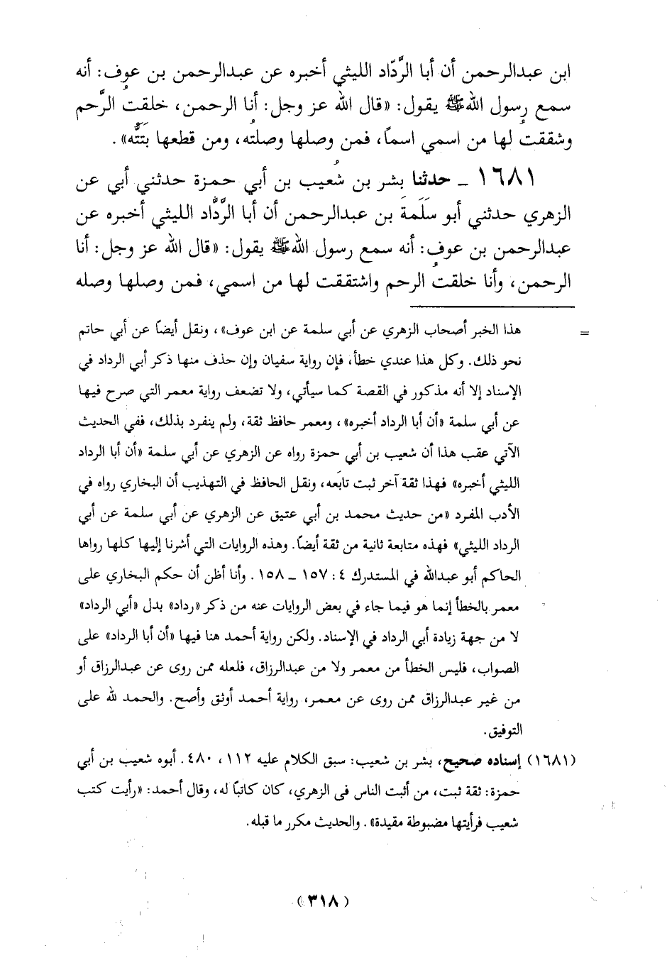 1681 - حدثنا بشر بن شُعيب بن أبي حمزة حدثني أبي عن الزهري حدثني أبو سَلَمةَ بن عبد الرحمن أن أبا الرَّدَّاد الليثي أخبره عن عبد الرحمن بن عوف: أنه سمع رسول الله - صلى الله عليه وسلم - يقول: ((قال الله عز وجل: أنا الرحمن، وأنا خلقتُ الرحم واشتققت لها من اسمي، فمن وصلها وصله