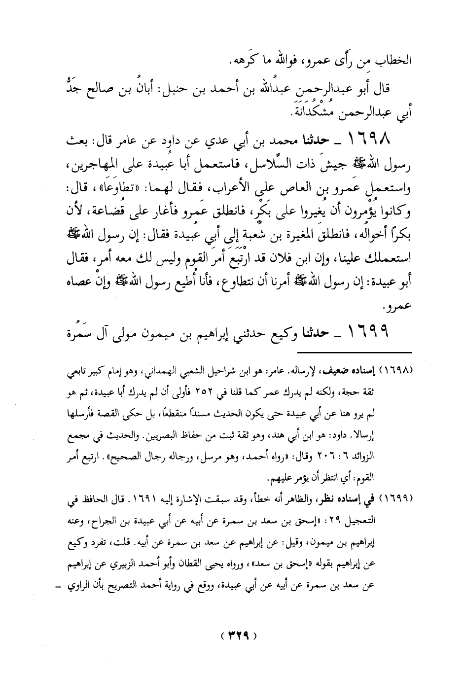 (1699) في إسناده نظر، والظاهر أنه خطأ، وقد سبقت الإشارة إليه 1691. قال الحافظ في التعجيل 29: "إسحق بن سعد بن سمرة عن أبيه عن أبي عبيدة بن الجراح، وعنه إبراهيم بن ميمون، وقيل: عن إبراهيم عن سعد بن سمرة عن أبيه. قلت، تفرد وكيع عن إبراهيم بقوله "إسحق بن سعد"، ورواه يحيى القطان وأبو أحمد الزبيري عن إبراهيم عن سعد بن سمرة عن أبيه عن أبي عبيدة، ووقع في رواية أحمد التصريح بأن الراوي =