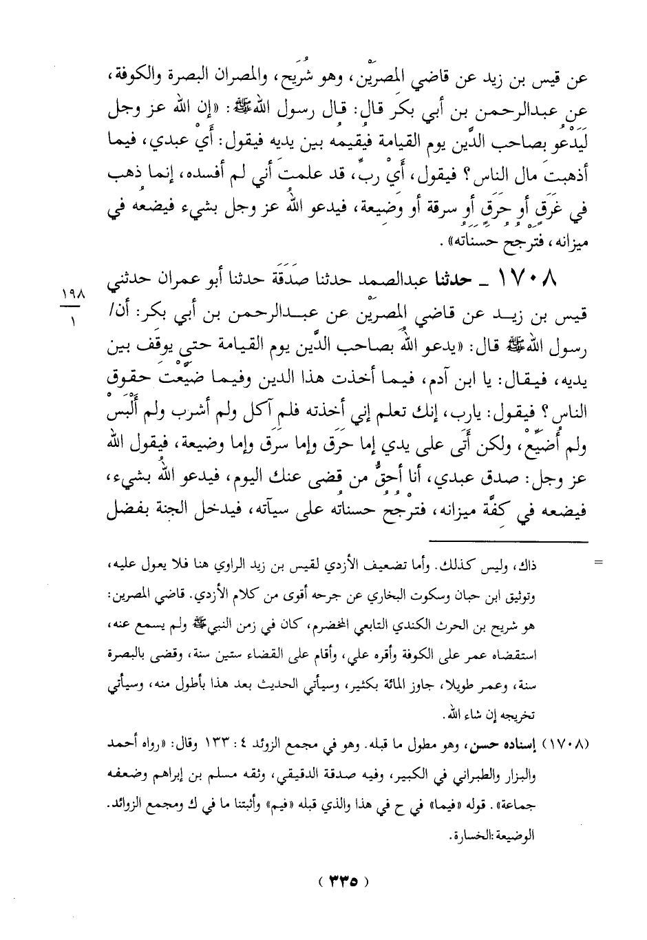 عن قيس بن زيد عن قاضي المصرَيْن، وهوشُرُيح، والمصران البصرة والكوفة، عن عبد الرحمن بن أبي بكَر قال: قال رسول الله - صلى الله عليه وسلم -: "إن الله عز وجل لَيَدْعُو بصاحب الدين يوم القيامة فيُقيمه بين يديه فيقول: أَيْ عبدي، فيما أذهبتَ مال الناس؟ فيقول، أَيْ ربِّ، قد علمتَ أني لم أفسده، إنما ذهب في غَرَقٍ أو حَرَقٍ أو سرقة أو وَضِيعة، فيدعو الله عز وجل بشيء فيضعُه في ميزانه، فتَرْجُحُ حَسَنَاتُه".