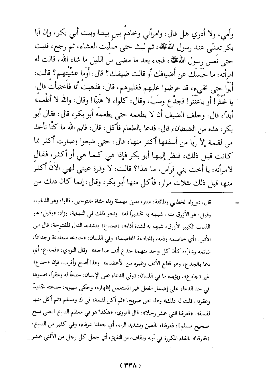 وأمي، ولا أدري هل قال: وامرأتي وخادمٌ بين بيتنا وبيت أبي بكر، وإن أبا بكر تعِشّى عند رسول الله - صلى الله عليه وسلم -، تم لبث حتى صُلِّيت العشاء، ثم رجع، فلبث حتى نعس رسول الله - صلى الله عليه وسلم -، فجاء بعد ما مضى منَ الليل مما شاء الله، قالت له امرأته: ما حَبَسَك عن أَضيافك أو قالت ضيفك؟ قال: أَوَما عشَّيْتهم؟ قالت: أَبَوْا حتيى تجيء، قد عرضوا عِليهم فغلبوهم، قال: فذهبتُ أنا فاَختبأت قال: يا غُنْثَرُ! أو ياعَنتَر! فجدَّع وسَبّ، وقال: كلوا، لا هَنيّا! وقال: والله لا أطْعمُه أبداً، قال: وحلف الضيف أن لا يطعمه حتى يطعمَه أبو بكر، قال: فقال أبو بكر: هذه من الشيطان، قال: فدعا بالطعام فأكل، قال: فايم الله ما كنَّا نأخذ من لقمة إلأ رَبا من أسفلها أكثر منها، قال: حتى شبعوا وصارت أكثر مما كانت قبل ذلك، فنظر إليها أبو بكر فإذا هي كما هي أو أكثر، فقال لامرأته: يا أخت بني فِرَاس، ما هذا؟ قالت: لا وقرة عيني لهي الآنَ أكثرُ منها قبل ذلك بثلاث مرار، فأكل منها أبو بكر، وقال: إنما كان ذلك من