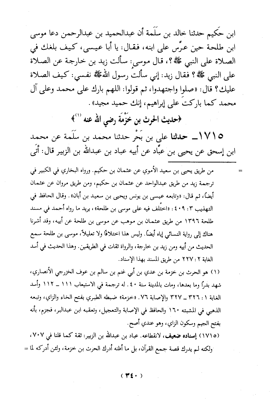 (1715) إسناده ضعيف، لانقطاعه. عباد بن عبد الله بن الزبير: ثقة كما قلنا في 707، ولكنه لم يدرك قصة جمع القرآن، بل ما أظنه أدرك الحرث بن خزمة، ولئن أدركه لما =