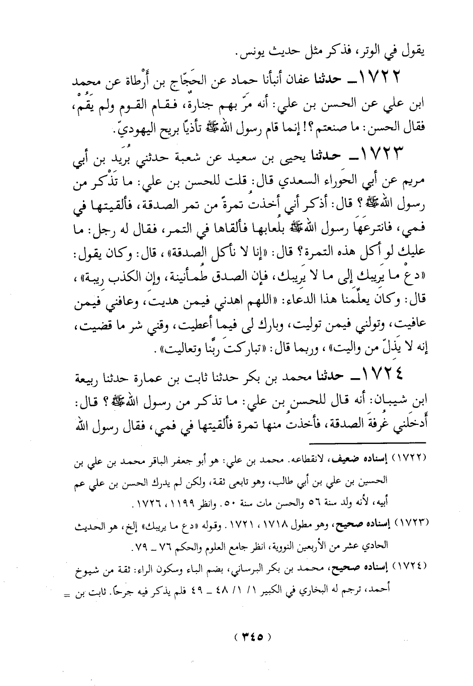 1723 - حدثنا يحيى بن سعيد عن شعبة حدثني بُرَيد بن أبي مريم عن أبي الحَوراء السعدي قال: قلت للحسن بن علي: ما تَذْكر من رسول الله - صلى الله عليه وسلم -؟ قال: أذكر أني أخذتُ تمرةً من تمر الصدقة، فألقيتها في فمي، فانترعَهَا رسول الله - صلى الله عليه وسلم - بلُعابها فألقاها في التمر، فقال له رجل: ما عليك لو أكل هذه التمرة؟ قال: "إنا لا يأكل الصدقة"، قال: وكان يقول: "دعْ ما يرِيبك إِلى ما لا يَرِيبك، فإن الصدق طُمأنينة، وإنِ الكذب رِيبة"، قال: وكان يعلَّمنا هذا الدعاء: "اللهم اهدني فيمن هديتَ، وعافني فيمن عافيت، وتولني فيمن توليت، وبارك لى فيما أعطيت، وقني شر ما قضيت، إنه لا يَذلّ من واليت"، وربما قال: "تباركتَ ربَّنا وتعاليت".