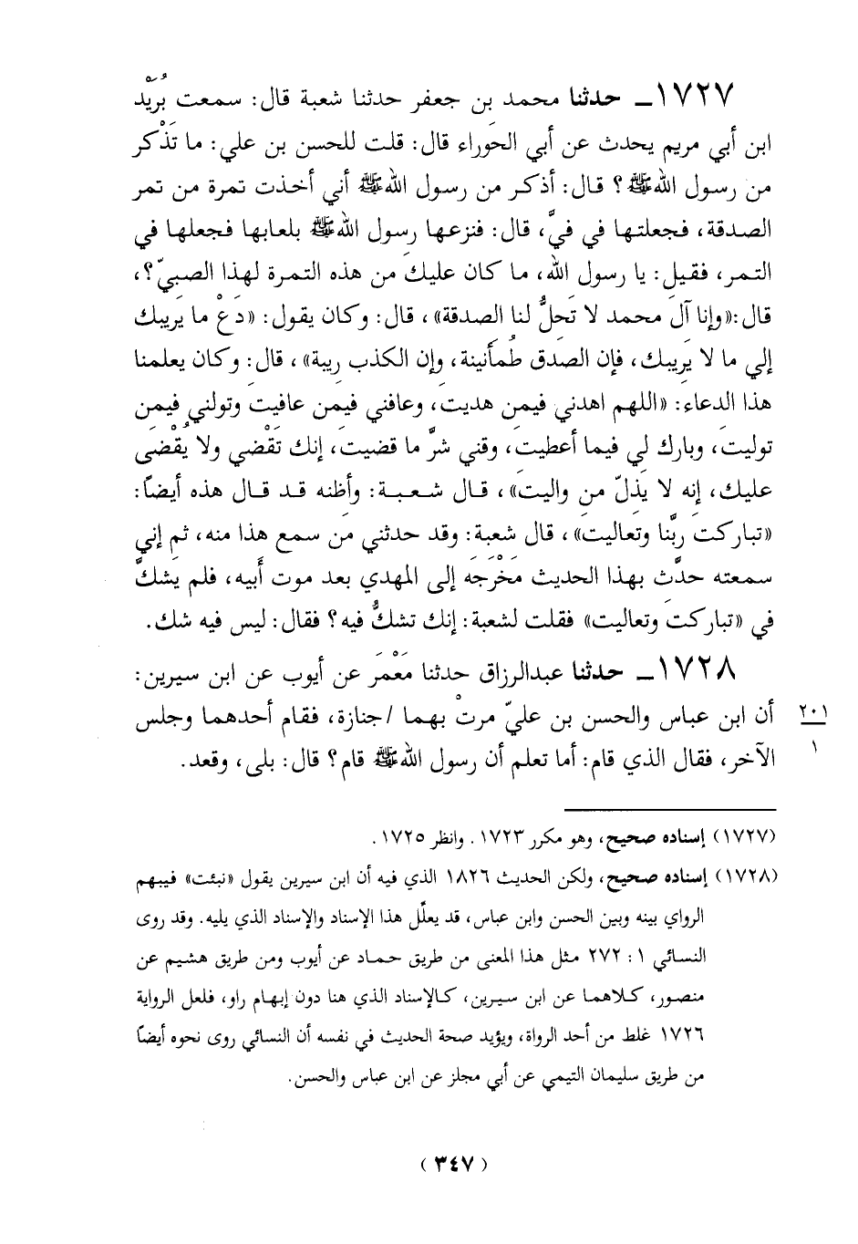 (1728) إسناده صحيح، ولكن الحديث 1826 الذي فيه أن ابن سيرين يقول "نبئت" فيبهم الرواي بينه وبين الحسن وابن عباس، قد يعلَّل هذا الإسناد والإسناد الذي يليه. وقد روى النسائي 1: 272 مثل هذا المعنى من طريق حماد عن أيوب ومن طريق هشيم عن منصور، كلاهما عن ابن سيرين، كالإسناد الذي هنا دون إبهام راو، فلعل الرواية 1726 غلط من أحد الرواة، ويؤيد صحة الحديث في نفسه أن النسائي روى نحوه أيضاً من طريق سليمان التيمي عن أبي مجلز عن أبن عباس والحسن.