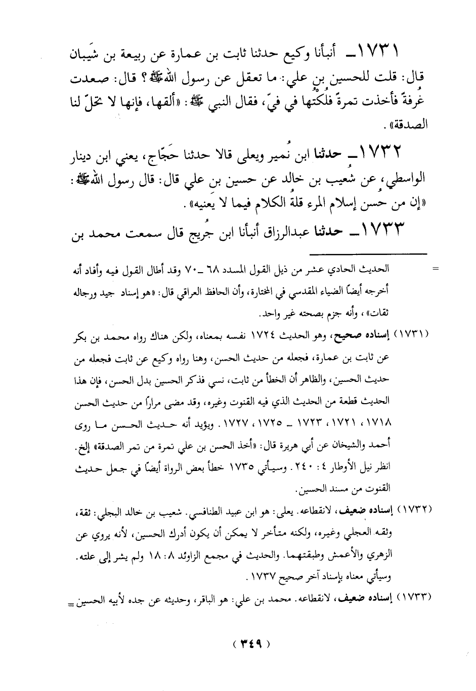 1732 - حدثنا ابن نُمير ويعلى قالا حدثنا حَجَّاج، يعني ابن دينار الواسطي، عن شُعيب بن خالد عن حسين بنِ على قال: قال رسول الله - صلى الله عليه وسلم -: "إن من حسن إسلام المرء قلة الكلام فيما لا يعنيه".