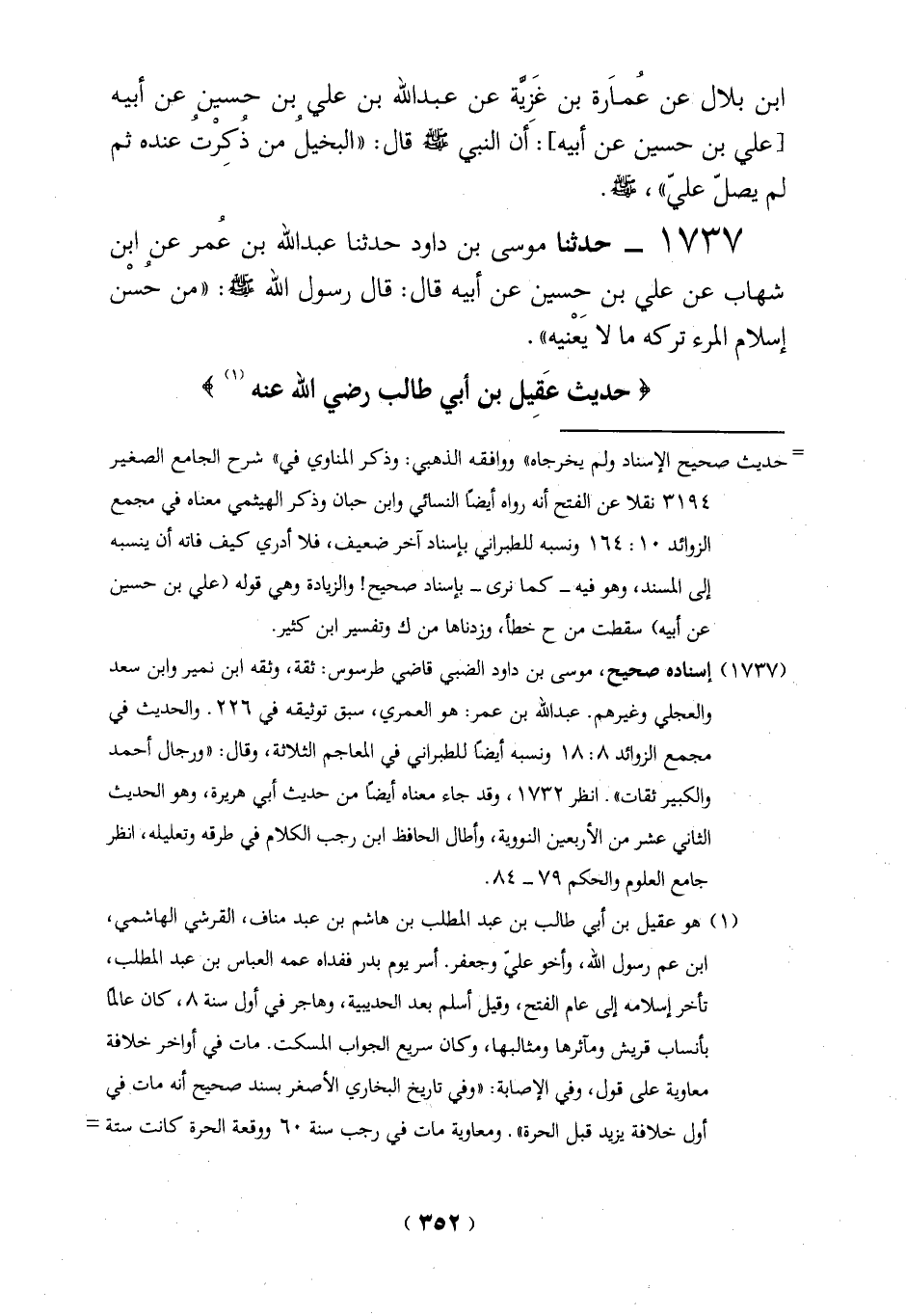 1737 - حدثنا موسى بن داود حدثنا عبد الله بن عمر عن ابن شهاب عن علي بن حسين عن أبيه قال: قال رسول الله - صلى الله عليه وسلم -: "من حسن إسلام المرء تركه ما لا يَعْنيه".