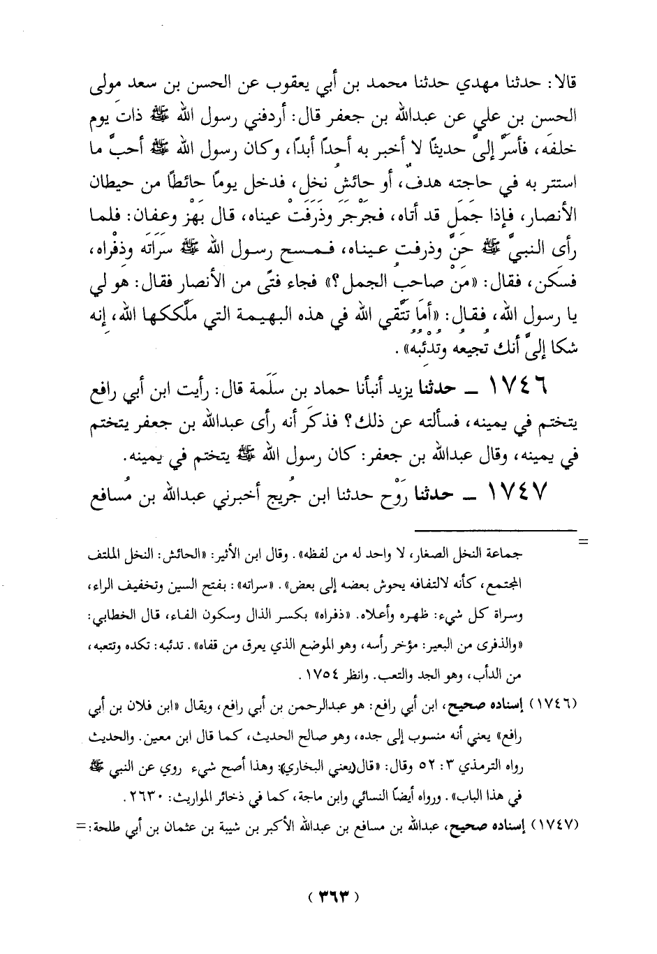 قالا: حدثنا مهدي حدثنا محمد بن أبي يعقوب عن الحسن بن سعد مولى الحسن بن علي عن عبد الله بن جعفر قال: أردفني رسول الله - صلى الله عليه وسلم - ذاتَ يوم خلفَه، فأسَّر إلىَّ حديثاً لا أخبر به أحدًا أبدًا، وكان رسول الله - صلى الله عليه وسلم - أحب ما استتر به في حاجته هدفٌ، أو حائشٍ نخِلِ، فدخل يوماً حائطاً من حيطان الأنصار، فإذا جَمِل قد أتاه، فجَرْجَر وذَرفتْ عيناه، قال بَهز وعفان: فلما رأى النبي - صلى الله عليه وسلم - حِن وذَرَفَتْ عيناه، فمسح رسول الله - صلى الله عليه وسلم - سَرَاتَه وذِفْراه، فسَكن، فقال: "منْ صاحبُ الجمل؟ " فجاء فتى من الأنصار فقال: هو لي يا رسول الله، فقال: "أمَا َتتَّقى الله في هذه البهيمة التى مَلَّككها الله، إِنه شكا إلىَّ أنك تجُيعُه وتُدْئِبُهُ".