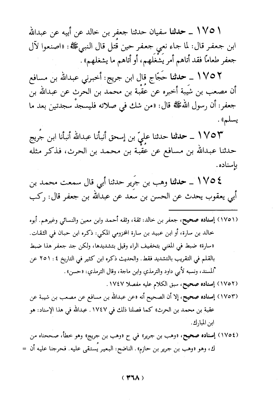 (1753) إسناده صحيح، إلا أن الصحيح أنه "عن عبد الله بن مسافع عن مصعب بن شيبة عن عقبة بن محمد بن الحرث" كما فصلنا ذلك في 1747. عبد الله في هذا الإسناد: هو ابن المبارك.