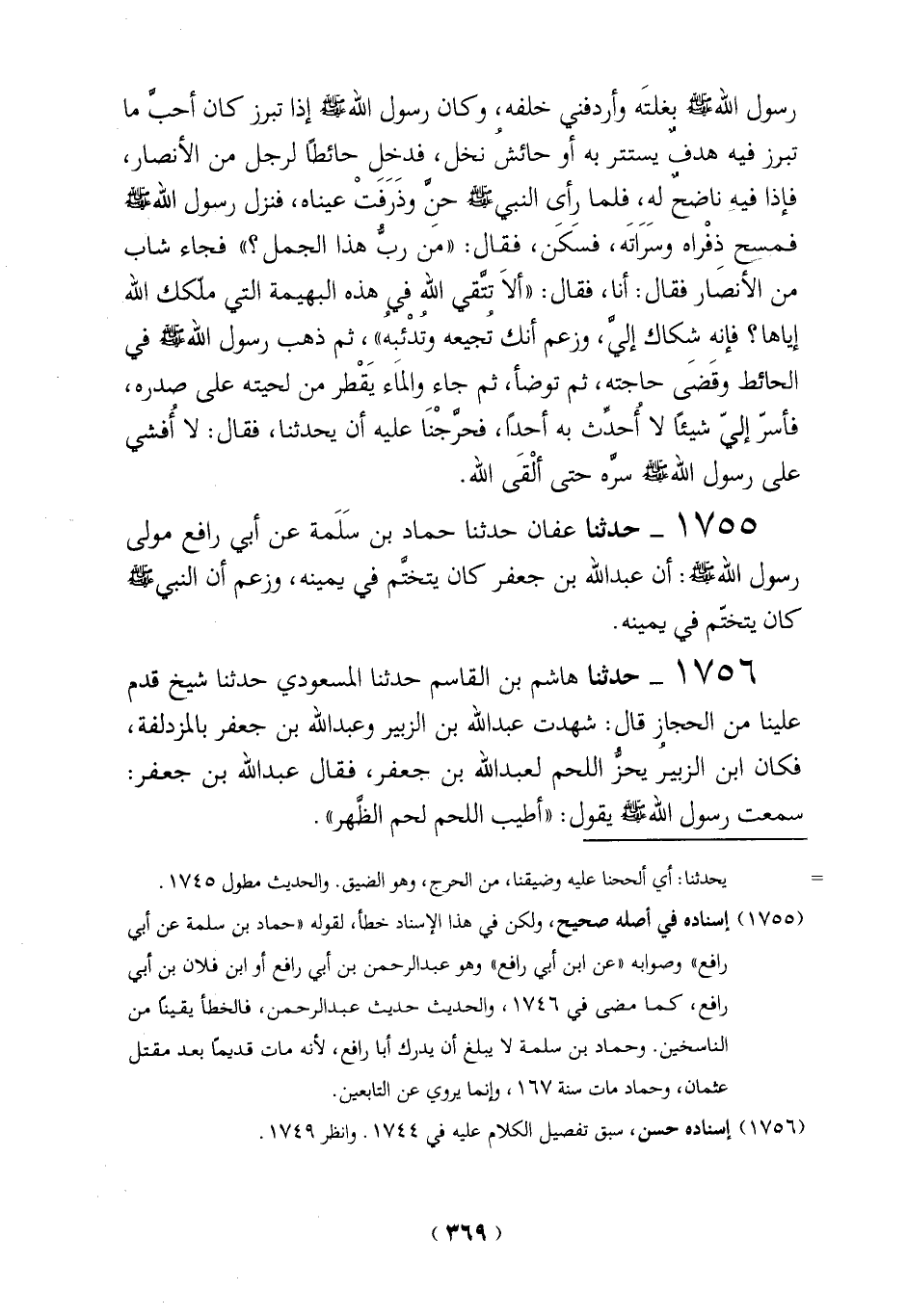 (1755) إسناده في أصله صحيح، ولكن في هذا الإسناد خطأ، لقوله "حماد بن سلمة عن أبي رافع" وصوابه "عن ابن أبي رافع" وهو عبد الرحمن بن أبي رافع أو ابن فلان بن أبي رافع، كما مضى في 1746، والحديث حديث عبد الرحمن، فالخطأ يقيناً من الناسخين. وحماد بن سلمة لا يبلغ أن يدرك أبا رافع، لأنه مات قديماً بعد مقتل عثمان، وحماد مات سنة 167، وإنما يروي عن التابعين.