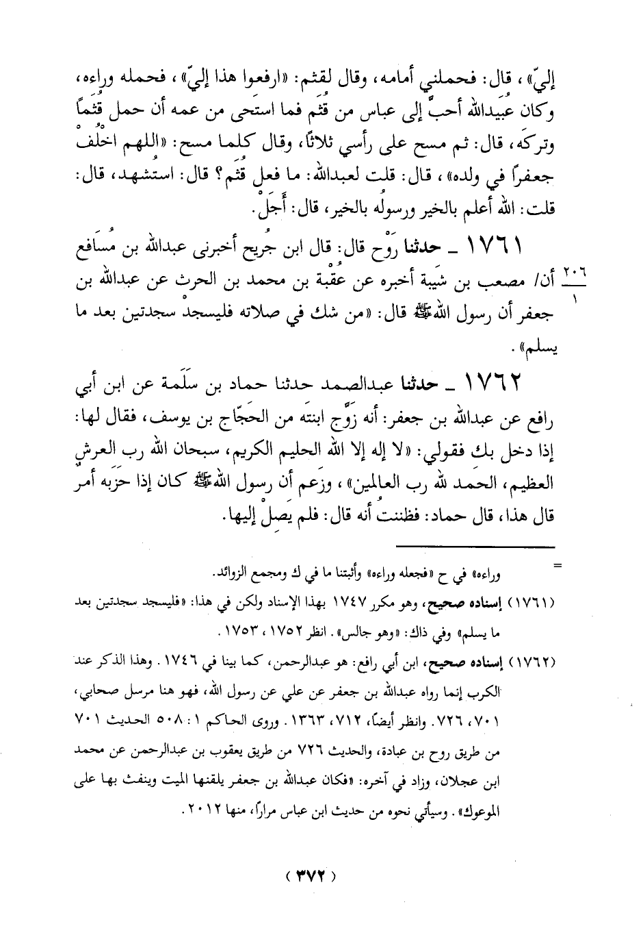 1761 - حدثنا رَوْح قال: قال ابن جُريح أخبرني عبد الله بن مُسَافع أن/ مصعب بن شَيبة أخبره عن عُقْبة بن محمد بن الحرث عن عبد الله بن جعفر أن رسول الله - صلى الله عليه وسلم - قال: "من شك في صلاته فليسجدْ سجدتين بعد ما يسلم".