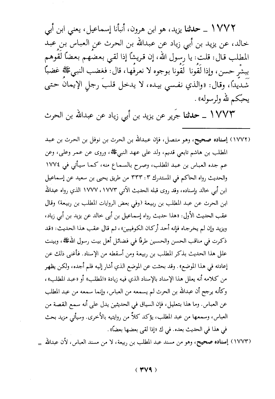 1772 - حدثنا يزيد، هو ابن هرون، أنبأنا إسماعيل، يعني ابن أبي خالد، عن يزيد بن أبي زياد عن عبد الله بن الحرث عن العباس بن عبد المطلب قال: قلت: يا رسول الله، إن قريشاً إذا لقي بعضهم بعضاً لَقُوهم ببشْرٍ حسن، وإذا لَقُونا لَقُونا بوجوه لا نعرفُها، قال: فغضب النبي - صلى الله عليه وسلم - غضباً شَدَيداً، وقال: "والذي نفسي بيده، لا يدخل قلبَ رجلٍ الإيمانُ حتى يحبّكم لله ولرسوله".