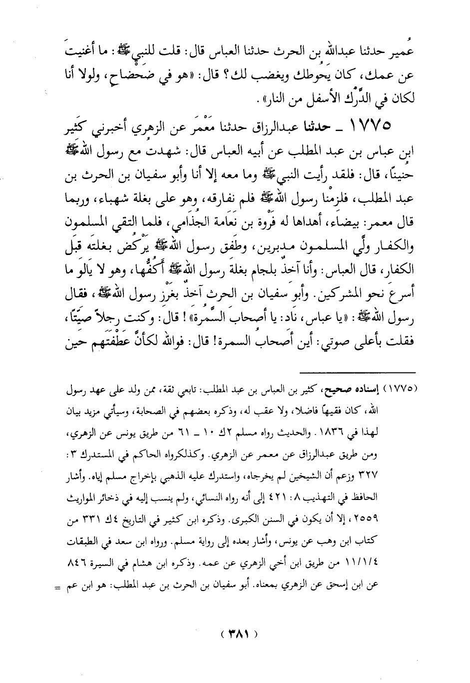 (1775) إسناده صحيح، كثير بن العباس بن عبد المطلب: تابعي ثقة، ممن ولد على عهد رسول الله، كان فقيهاً فاضلا، ولا عقب له، وذكره بعضهم في الصحابة، وسيأتي مزيد بيان لهذا في 1836. والحديث رواه مسلم 2 ك 10 - 61 من طريق يونس عن الزهري، ومن طريق عبد الرزاق عن معمر عن الزهري. وكذلك رواه الحاكم في المستدرك 3: 327 وزعم أن الشيخين لم يخرجاه، واستدرك عليه الذهبي بإخراج مسلم إياه. وأشار الحافظ في التهذيب 8: 421 إلى أنه رواه النسائي، ولم ينسب إليه في ذخائر المواريث 2559، إلا أن يكون في السنن الكبرى. وذكره ابن كتير في التاريخ 4 ك 331 من كتاب ابن وهب عن يونس، وأشار بعده إلى رواية مسلم. ورواه ابن سعد في الطبقات 4/ 1/ 1 من طريق ابن أخي الزهري عن عمه. وذكره ابن هشام في السيرة 846 عن ابن إسحق عن الزهري بمعناه. أبو سفيان بن الحرث بن عبد المطلب: هو ابن عم =