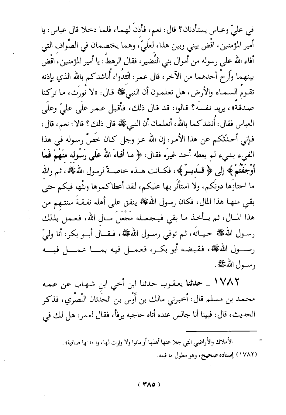 في عليّ وعباس يستأذنان؟ قال: نعم، فأذنَ لهما، فلما دخلا قال عباس: يا أمير المؤمنين، اقْض بينى وبين هذا، لعَليّ، وهما يختصمان في الصَّوافِ التي أفاء الله على رسوله من أموال بني النَّضير، فقال الرهطُ: يا أمير المؤمنين، اقْض بينهما وأَرحْ أحدهما من الآخر، قال عمر: اتّئدُوا، أُناشدكم بالله الذي بإذنه تقوم السماء والأرض، هل تعلمون أن النبيَ - صلى الله عليه وسلم - قال: "لا نُورَث، ما تركنا صدقةٌ"، يريد نفسَه؟ قالوا: قد قال ذلك، فأقبل عمر علَى عليّ وعلَى العباس فقال: أُنشدكما بالله، أتعلمان أن النبي - صلى الله عليه وسلم - قال ذلك؟ قالا: نعم، قال: فإني أحدّثكم عن هذا الأمر: إن الله عز وجل كان خَصَّ رسوله فىٍ هذا الفيء بشيء لم يعطه أحد غيرَه فقال: {وَمَا أَفَاءَ اللَّهُ عَلَى رَسُولِهِ مِنْهُمْ فَمَا أَوْجَفْتُمْ} إلى {قَدِيرٌ}، فكانت هذه خاصةً لرسول الله - صلى الله عليه وسلم -، ثم واللهِ ما احتازَها دونَكم، ولَا استأثَر بها عليكم، لقد أعطاكموها وبثَّها فيكم حتى بقى منها هذا المال، فكان رسول الله - صلى الله عليه وسلم - ينفق على أهله نفقةَ سنتهِم من هذا المال، ثم يأخذ ما بقي فيجعله مَجْعَلَ مالِ الله، فعمل بذلك رسول الله - صلى الله عليه وسلم - حياتَه، ثم توفي رسول الله - صلى الله عليه وسلم -، فقال أبو بكر: أنا وليّ رسول الله - صلى الله عليه وسلم -، فقبضه أبو بكر، فعمل فيه بما عمل فيه رسول الله - صلى الله عليه وسلم -.