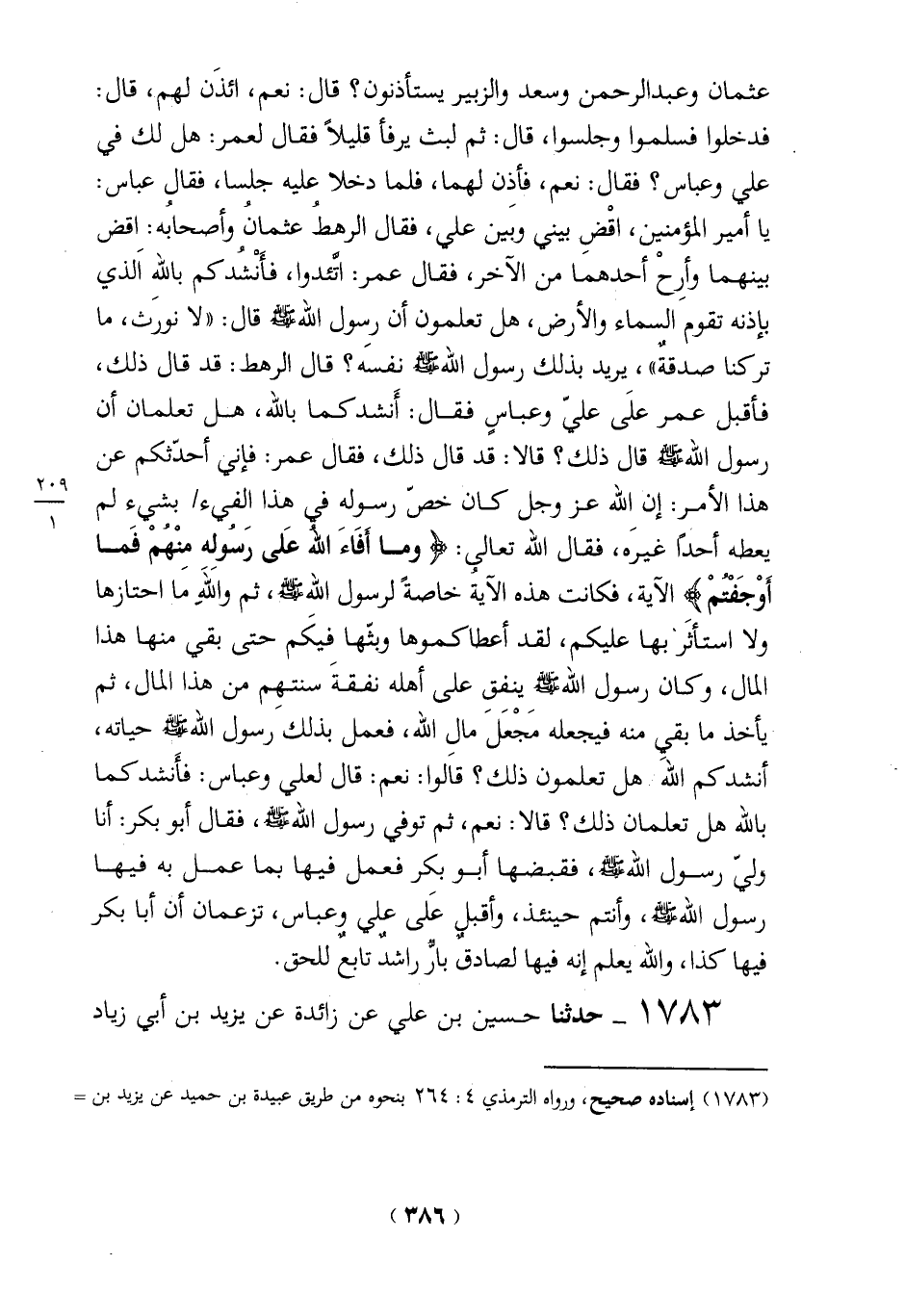 عثمان وعبد الرحمن وسعد والزبير يستأذنون؟ قال: نعم، ائذَن لهم، قال: فدخلوا فسلموا وجلسوا، قال: ثم لبث يرفأ قليلاً فقال لعمر: هل لك في علي وعباس؟ فقال: نعم، فأذِن لهما، فلما دخلا عليه جلسا، فقال عباس: يا أمير المؤمنين، اقْضِ بيني وبين علي، فقال الرهطُ عثمانُ وأصحابهُ: اقض