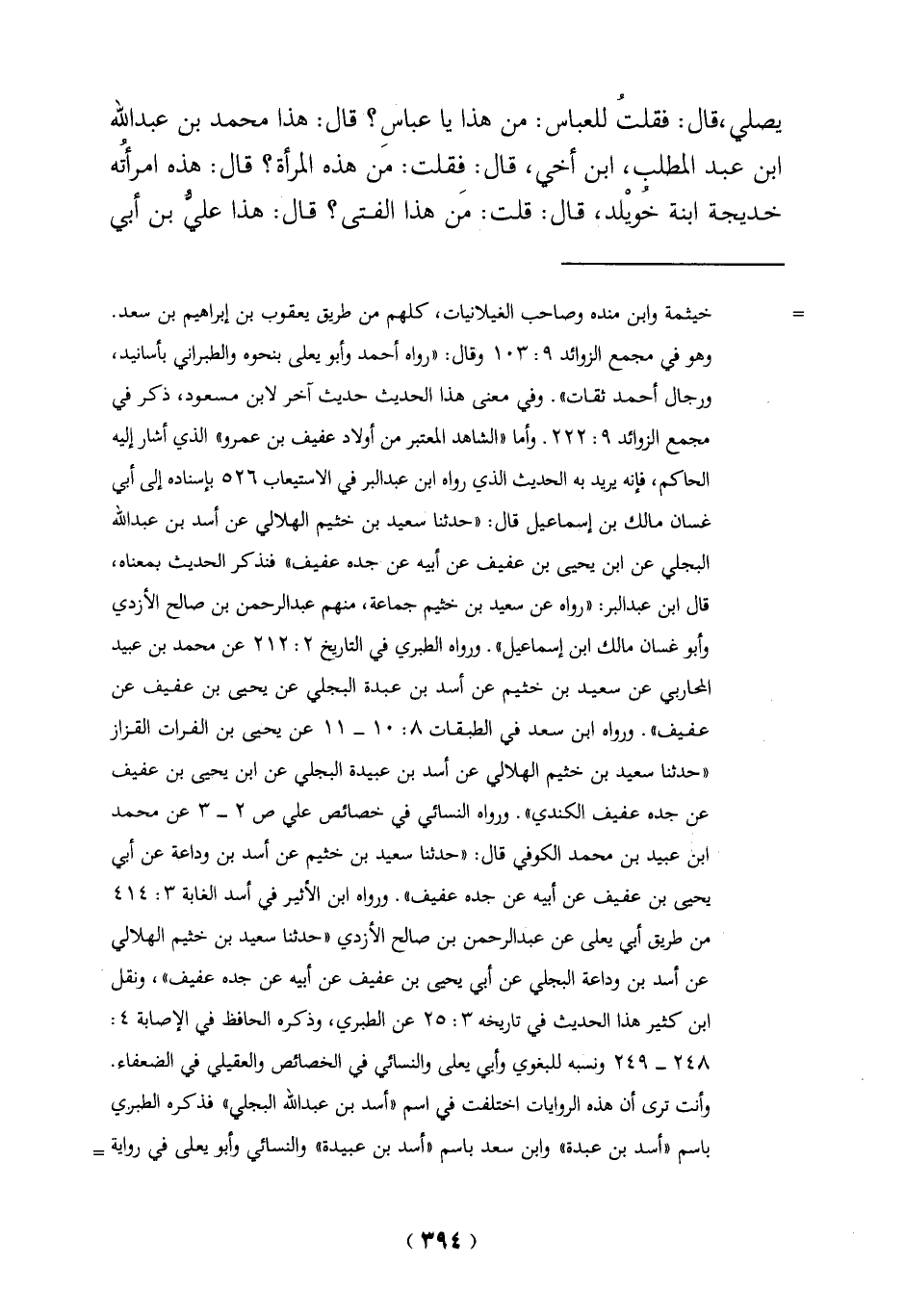 يصلي، قال: فقلتُ للعباس: من هذا يا عباسِ؟ قال: هذا محمد بن عبد الله ابن عبد المطلب، ابن أخى، قال: فقلت: من هذه المرأة؟ قال: هذه امرأتُه خديجة ابنة خُويْلد، قال: قلت: مَن هذا الفتى؟ قال: هذا عليُّ بن أبي