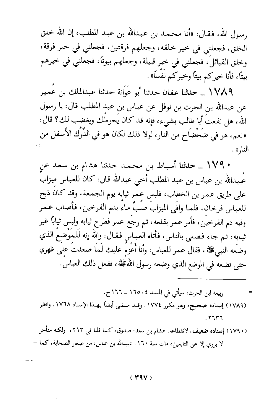 1789 - حدثنا عفان حدثنا أبو عَوَانة حدثنا عبد الملك بن عُمير عن عبد الله بن الحرث بن نوفل عن عباس بنِ عبد المطلب قال: يا رسول الله، هل نفعتَ أبا طالب بشيء، فإنه قد كان يحوطُك ويغضب لك؟ قال: "نعم، هو في ضَحْضَاح من النار، لولا ذلك لكان هو في الدرك الأسفل من لنار".