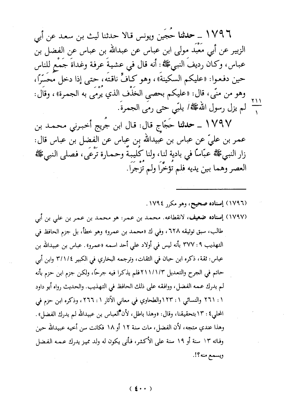 (1797) إسناده ضعيف، لانقطاعه. محمد بن عمر: هو محمد بن عمر بن علي بن أبي طالب، سبق توثيقه 628، وفى ك "محمد بن عمرو" وهو خطأ، بل جزم الحافظ في التهذيب 9: 377 بأنه ليس في أولاد علي أحد اسمه "عمرو". عباس بن عبيد الله بن عباس: ثقة، ذكره ابن حبان في الثقات، وترجمه البخاري في الكبير 4/ 1/ 3وابن أبي حاتم في الجرح والتعديل 3/ 1/211 فلم يذكرا فيه جرحاً، ولكن جزم ابن حزم بأنه لم يدرك عمه الفضل، ووافقه على ذلك الحافظ في التهذيب. والحديث رواه أبو داود 1: 261 والنسائي 1: 123 والطحاوي في معانى الآثار 1: 266، وذكره ابن حزم في المحلي 4: 13 بتحقيقنا، وقال: "وهذا باطل، لأن العباس بن عبيد الله لم يدرك الفضل".
