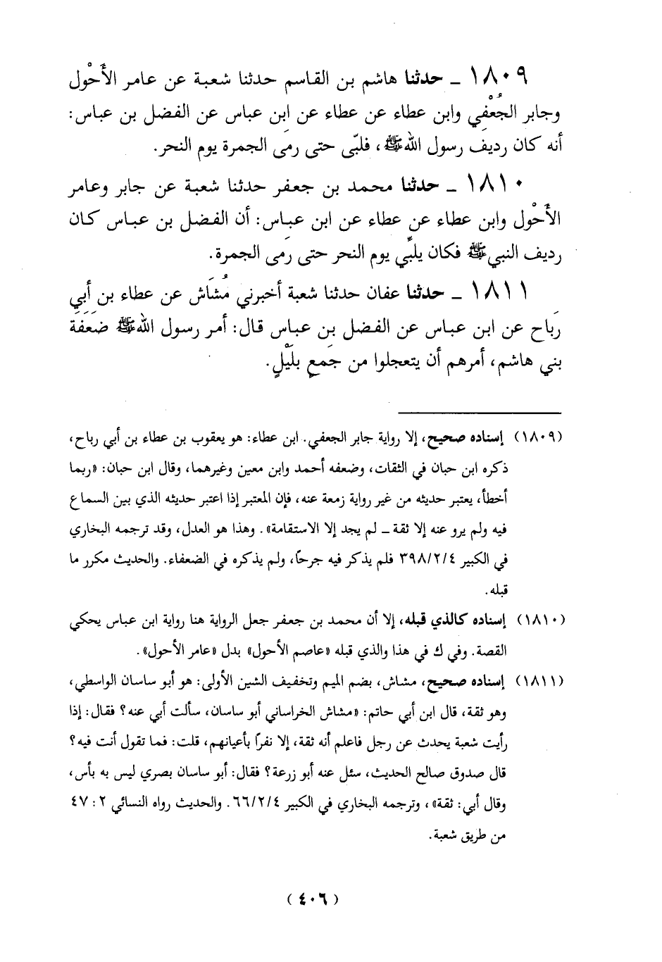 1809 - حدثنا هاشم بن القاسم حدثنا شعبة عن عامر الأحْول وجابر الجعْفِي وابن عطاء عن عطاء عن ابن عباس عن الفضل بن عباس: أنه كان رديف رسول الله - صلى الله عليه وسلم -، فلبّى حتى رمَى الجمرة يوم النحر.