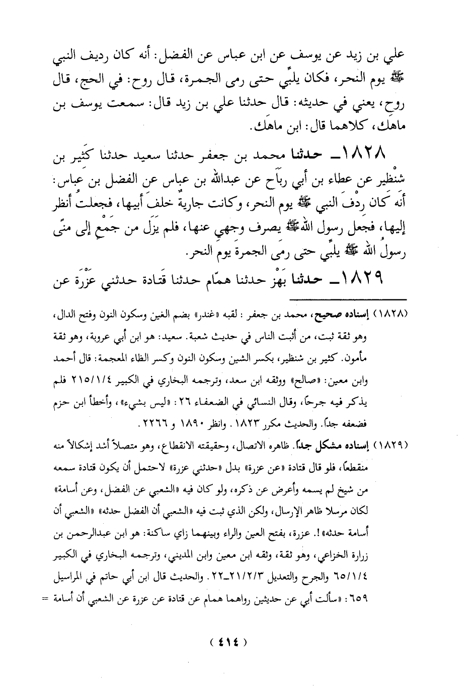علي بن زيد عن يوسف عن ابن عباس عن الفضل: أنه كان رديف النبي - صلى الله عليه وسلم - يوم النحر، فكان يلبِّى حتى رمى الجمرة، قال روح: في الحج، قال روحِ، يعني في حديثه: قال حدثنا على بن زيد قال: سمعت يوسف بن ماهَك، كلاهما قال: ابن ماهَك.