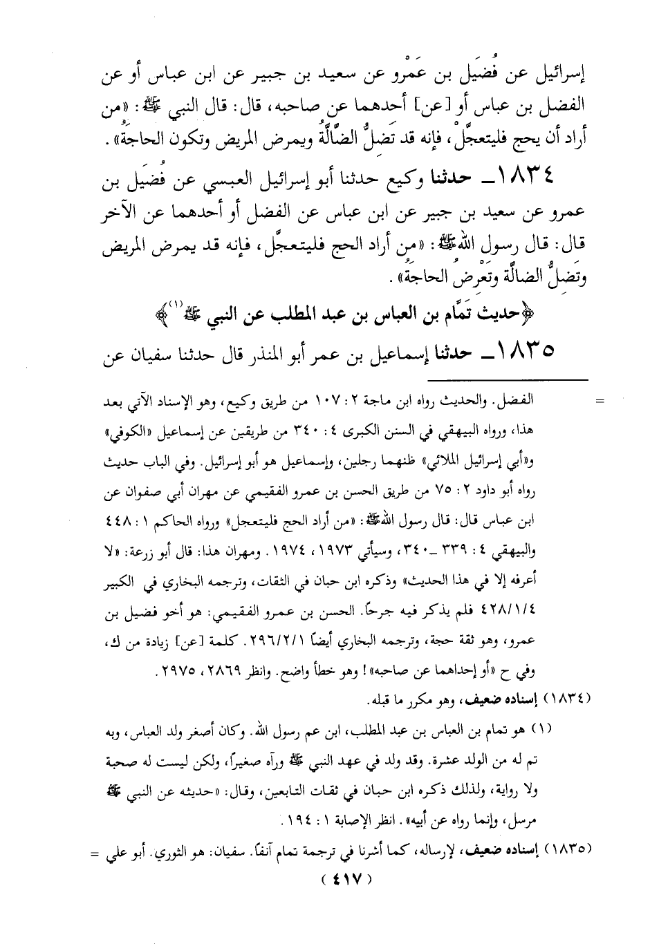 1834 - حدثنا وكيع حدثنا أبو إسرائيل العبسي عن فَضَيل بن عمرو عن سعيد بن جبير عن ابن عباس عن الفضل أو أحدهما عن الآخر قال: قال رسولِ الله - صلى الله عليه وسلم -: "مِن أراد الحج فليتعجَّل، فإنه قد يمرض المريض وتَضِلُّ الضالَّة وتعْرِض الحاجَةُ".
