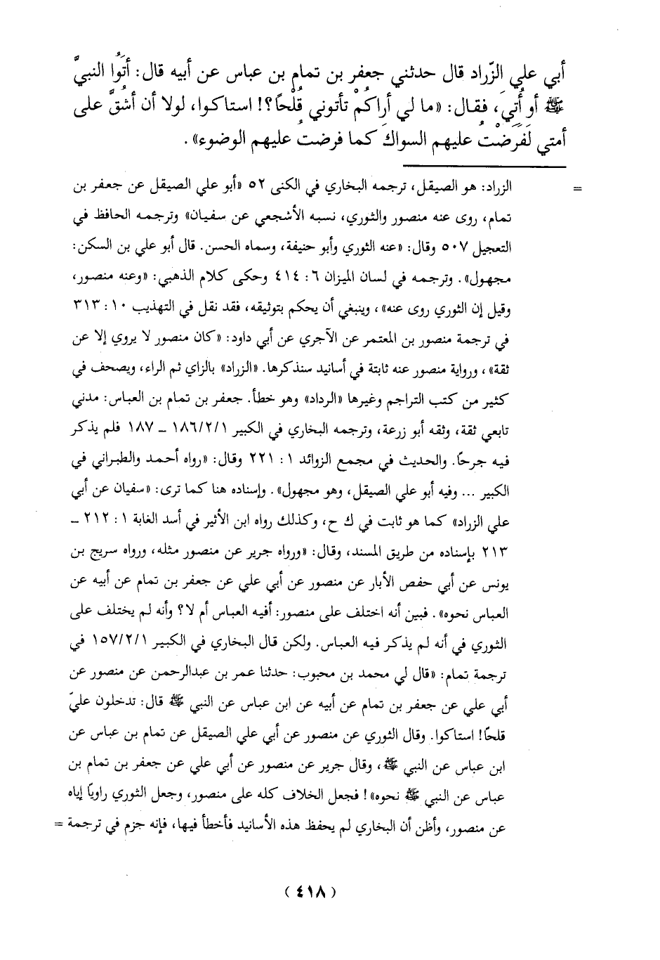 = الزراد: هو الصيقل، ترجمه البخاري في الكنى 52 "أبو على الصيقل عن جعفر بن تمام، روى عنه منصور والثوري، نسبه الأشجعي عن سفيان" وترجمه الحافظ في التعجيل 507 وقال: "عنه الثوري وأبو حنيفة، وسماه الحسن. قال أبو علي بن السكن: مجهول". وترجمه في لسان الميزان 6: 414 وحكى كلام الذهبي: "وعنه منصور، وقيل إن الثوري روى عنه"، وبنبغي أن يحكم بتوثيقه، فقد نقل في التهذيب 10: 313 في ترجمة منصور بن المعتمر عن الآجري عن أبي داود: "كان منصور لا يروي إلا عن ثقة"، ورواية منصور عنه ثابتة في أسانيد سنذكرها. "الزراد" بالزاي ثم الراء، ويصحف في كثير من كتب التراجم وغيرها "الرداد" وهو خطأ. جعفر بن تمام بن العباس: مدني تابعي ثقة، وثقه أبو زرعة، وترجمه البخاري في الكبير1/ 2/ 186 - 187 فلم يذكر فيه جرحاً. والحديث في مجمع الزوائد 1: 221 وقال: "رواه أحمد والطبراني في الكبير ... وفيه أبو علي الصيقل، وهو مجهول". وإسناده هنا كما ترى: "سفيان عن أبي على الزراد" كما هو ثابت في ك ح، وكذلك رواه ابن الأثير في أسد الغابة1: 212 - 213 بإسناده من طريق المسند، وقال: "ورواه جرير عن منصور مثله، ورواه سريج بن يونس عن أبي حفص الأبار عن منصور عن أبي على عن جعفر بن تمام عن أبيه عن العباس نحوه". مبين أنه اختلف على منصور: أفيه العباس أم لا؟ وأنه لم يختلف على الثوري في أنه لم يذكر فيه العباس. ولكن قال البخاري في الكبير 1/ 2/ 157 في ترجمة تمام: "قال لى محمد بن محبوب: حدثنا عمر بن عبد الرحمن عن منصور عن أبي علي عن جعفر بن تمام عن أبيه عن ابن عباس عن النبي - صلى الله عليه وسلم - قال: تدخلون عليّ قلحاً! استاكوا. وقال الثوري عن منصور عن أبي علي الصيقل عن تمام بن عباس عن ابن عباس عن النبي - صلى الله عليه وسلم -، وقال جرير عن منصور عن أبي علي عن جعفر بن تمام بن عباس عن النبي - صلى الله عليه وسلم - نحوه"! فجعل الخلاف كله على منصور، وجعل الثوري راوياً إياه عن منصور، وأظن أن البخاري لم يحفظ هذه الأسانيد فأخطأ فيها، فإنه جزم في ترجمة =