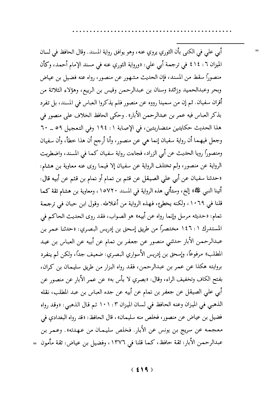 = أبي علي في الكنى بأن الثوري يروي عنه، وهو يوافق رواية المسند. وقال الحافظ في لسان الميزان 6: 414 في ترجمة أبي علي: "ورواية الثوري عنه في مسند الإمام أحمد، وكأن منصوراً سقط من المسند، فإن الحديث مشهورعن منصور، رواه عنه فضيل بن عياض وبحر وعبد الحميد وزائدة وسنان بن عبد الرحمن وقيس بن الربيع، وهؤلاء الثلاثة من أقران سفيان. ثم إن من سمينا رووه عن منصور فلم يذكروا العباس في المسند، بل نفرد بذكر العباس فيه عمر بن عبد الرحمن الأبار". وحكى الحافظ الخلاف على منصور في هذا الحديث حكايتين متضاربتين، في الإصابة 1: 194 وفى التعجيل 59 - 60 وجعل فيهما أن رواية سفيان إنما هي عن منصور، وأنا أرجح أن هذا خطأ، وأن سفيان ومنصوراً رويا الحديث عن أبي الزراد، فجاءت رواية سفيان كما في المسند، واضطربت الرواية عن منصور، ولم تختلف الرواية عن سفيان إلا فيما روى عنه معاوية بن هشام: "حدثنا سفيان عن أبي على الصيقل عن قثم بن تمام أو تمام بن قثم عن أبيه قال: أتينا النبي - صلى الله عليه وسلم - إلخ، وستأتي هذه الرواية في المسند 15720، ومعاوية بن هشام ثقة كما قلنا في 1069، ولكنه يخطئ فهذه الرواية من أغلاطه. وقول ابن حبان في ترجمة تمام: "حديثه مرسل وإنما رواه عن أبيه" هو الصواب، فقد روى الحديث الحاكم في المستدرك 1: 146 مختصراً من طريق إسحق بن إدريس البصري: "حدثنا عمر بن عبد الرحمن الأبار حدثني منصور عن جعفر بن تمام عن أبيه عن العباس بن عبد المطلب" مرفوعاً، وإسحق بن إدريس الأسواري البصري: ضعيف جداً، ولكن لم ينفرد بروايته هكذا عن عمر بن عبد الرحمن، فقد رواه البزار من طريق سليمان بن كران، بفتح الكاف وتخفيف الراء، وقال: "بصري لا بأس به" عن عمر الأبار عن منصور عن أبي على الصيقل عن جعفر بن تمام عن أبيه عن جده العباس بن عبد المطلب، نقله الذهبي في الميزان وعنه الحافظ في لسان الميزان 3: 101 ثم قال الذهبي: "وقد رواه فضيل بن عياض عن منصور، فخلص منه سليمان"، قال الحافظ: "قد رواه البغدادي في معجمه عن سريج بن يونس عن الأبار. فخلص سليمان من عهدته". وعمر بن