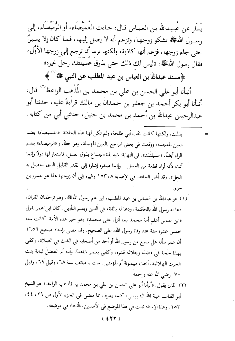 = بذلك، ولكنها كانت تحت أبي طلحة، ولم تكن لها هذه الحادثة. "الغميصاء" بضم الغين المعجمة, ووقعت في بعض المراجع بالعين المهملة، وهو خطأ. و"الرميصاء" بضم الراء أيضاً. "عسيلتك": في النهاية: شبه لذة الجماع بذوق العسل، فاستعار لها ذوقاً وإنما أنت لأنه أراد قطعة من العسل ... وإنما صغره إشارة إلى القدر القليل الذي يحصل به الحِل". وقد أشار الحافظ في الإصابة 8: 153 وغيره إلى أن زوجها هذا هو عمرو بن حزم.
