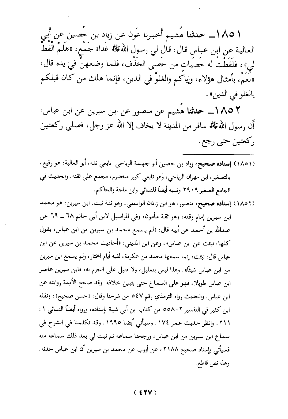1851 - حدثنا هُشيم أَخبرنا عَون عن زياد بن حُصين عن أَبي العالية عن اين عباس قال: قال لي رسول الله - صلى الله عليه وسلم - غَداة جَمْعٍ: "هَلمَّ الْقُطْ ليِ"، فلَقَطْتُ له حَصَياتٍ من حَصى الخَذْف، فلما وضعهنَّ في يده قال: "نعمْ، بأمثال هؤلاء، وإياكم والغلوَّ في الدين، فإنما هلك من كان قبلكم بالغلو في الدين".