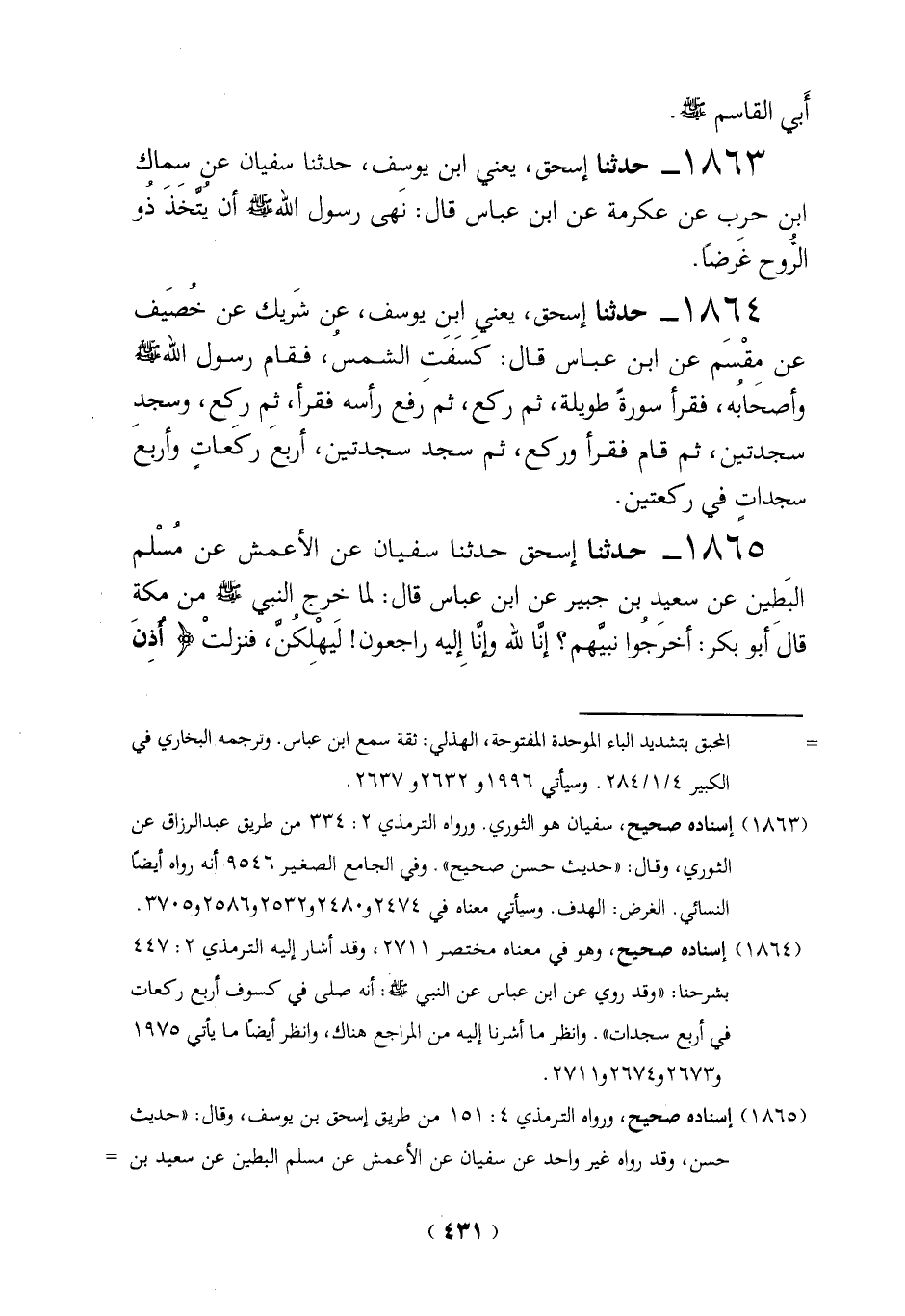 1863 - حدثنا إسحق، يعني ابن يوسف، حدثنا سفيان عن سِماك اين حرِب عن عكرمة عن ابن عباس قال: نَهى رسول الله - صلى الله عليه وسلم - أن يُتَّخذَ ذُو الرُّوح غرضاً.