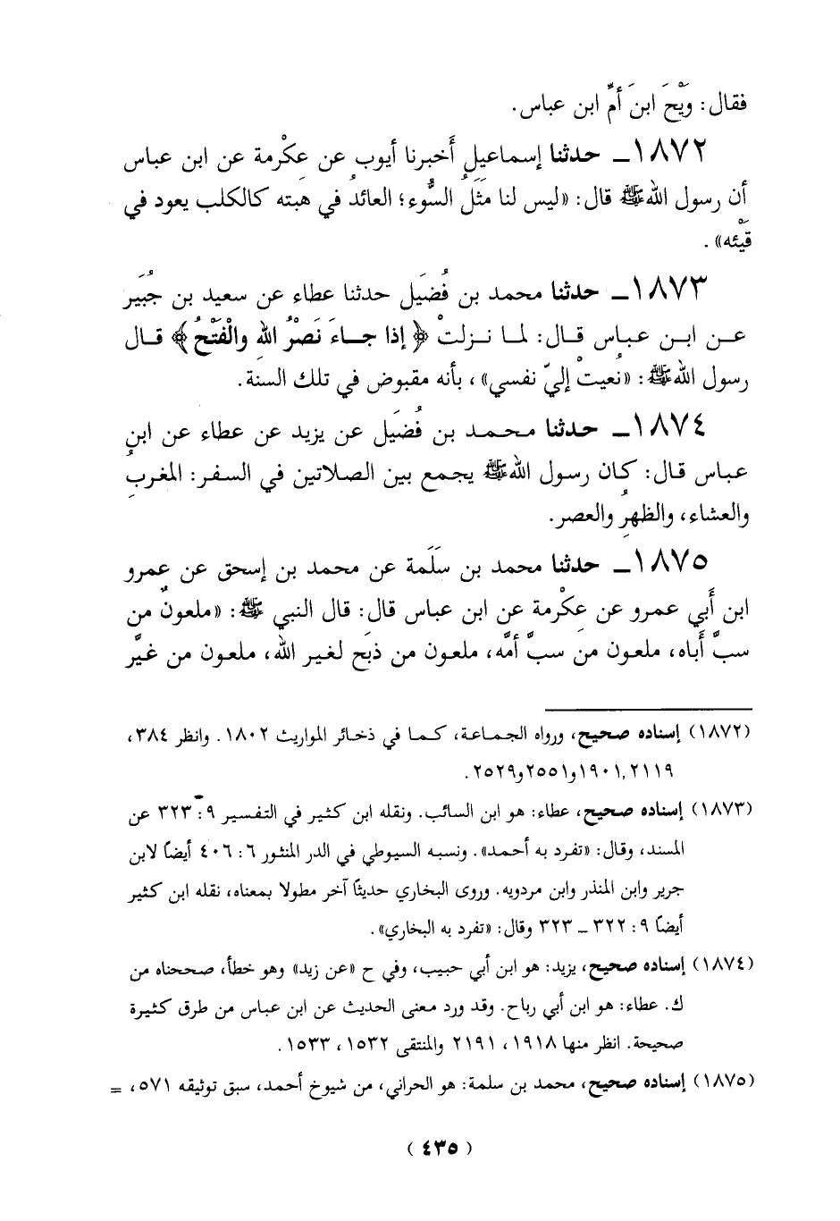 1873 - حدثنا محمد بن فُضَيل حدثنا عطاء عن سعيد بن جُبَير عن ابن عباس قال: لما نزلتْ {إِذَا جَاءَ نَصْرُ اللَّهِ وَالْفَتْحُ (1)} قال رسول الله - صلى الله عليه وسلم -: "نُعيتْ إليّ نفسي"، بأنه مقبوض في تلك السنَة.