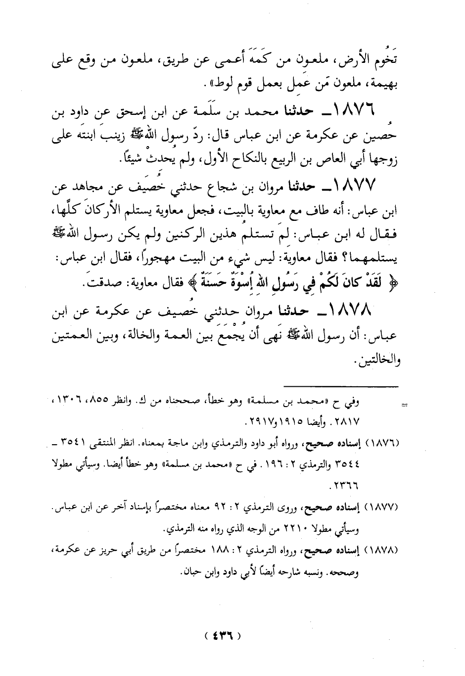 1876 - حدثنا محمد بن سَلَمة عن ابن إسحق عن داود بن حُصين عن عكرمة عن ابن عباس قال: ردّ رسول الله - صلى الله عليه وسلم - زينبَ ابنتَه على زوجها أبي العاص بن الربيع بالنكاح الأول، ولم يُحدِثْ شيئاً.