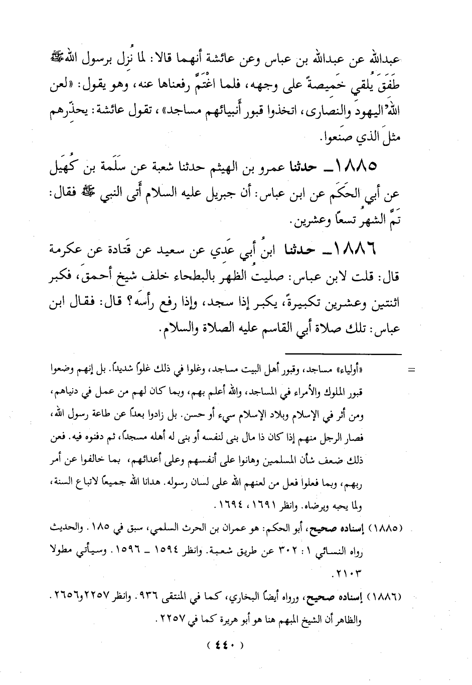 = "أولياء" مساجد، وقبور أهل البيت مساجد، وغلوا في ذلك غلواً شديدَاً. بل إنهم وضعوا قبور الملوك والأمراء في المساجد، والله أعلم بهم، وبما كان لهم من عمل في دنياهم، ومن أثر في الإسلام وبلاد الإسلام سيء أو حسن. بل زادوا بعداً عن طاعة رسول الله، فصار الرجل منهم إذا كان ذا مال بني لنفسه أو بني له أهله مسجداً، ثم دفنوه فيه. فعن ذلك ضعف شأن المسلمين وهانوا على أنفسهم وعلى أعدائهم، بما خالفوا عن أمر ربهم، وبما فعلوا فعل من لعنهم الله على لسان رسوله. هدانا الله جميعاً لاتباع السنة، ولما يحبه ويرضاه. وانظر 1691، 1694.