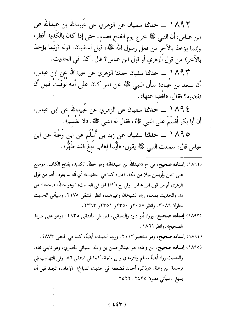 1892 - حدثنا سفيان عن الزهري عن عُبيد الله بن عبد الله عن ابن عباس: أن النبي - صلى الله عليه وسلم - خرج يوم الفتح فصام، حتى إذا كان بالكَديد أفطر، وإنما يؤخذ بالآخر من فعل رسول الله - صلى الله عليه وسلم -، قيل لسفيان: قوله "إنَما يؤخذ بالآخر" من قول اَلزهري أو قول ابن عباس؟ قال: كذا في الحديث.