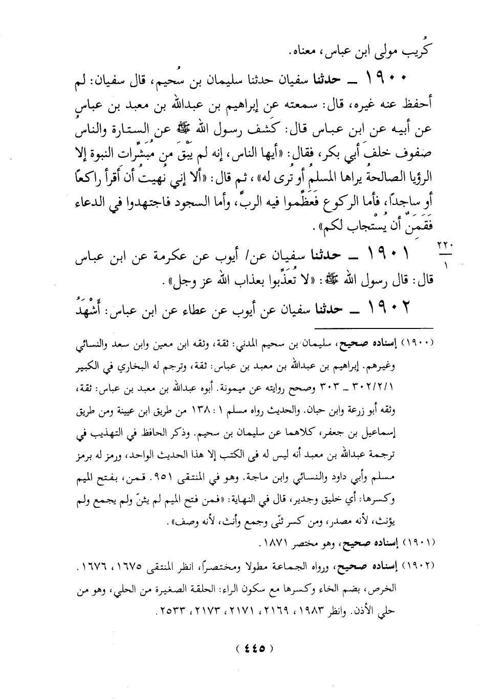 1900 - حدثنا سفيان حدثنا سليمان بن سُحيم، قال سفيان: لم أحفظ عنه غيره، قال: سمعته عن إبراهيم بن عبد الله بن معبد بن عباس عن أبيه عن ابن عباس قال: كَشف رسول الله - صلى الله عليه وسلم - عن الستارة والناسُ صفوف خلف أبي بكر، فقال: "أيها الناس، إنه لم يَبْقَ مبن مُبَشِّرات النبوة إلا الرؤيا الصالحةُ يراها المسلمُ أو تُرى له"، ثم قال: "ألا إني نُهيتُ أن أَقرأ راكعاً أو ساجداً، فأما الركوع فَعَظِّموا فيه الربَّ، وأما السجود فاجتهدوا في الدعاء فَقَمِنٌ أن يُسْتجاب لكم".