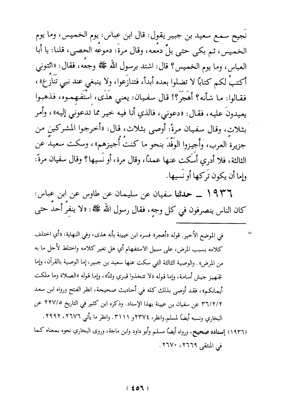 = في الموضع الأخير. قوله "أهجر" فسره ابن عيينة بأنه هذى، وفى النهاية: "أي اختلف كلامه بسبب المرض، على سبيل الاستفهام أي هل تغيركلامه واختلط لأجل ما به من المرض". والوصية الثالثة التى سكت عنها سعيد بن جبير، إما الوصية بالقرآن، وإما تحهيز جيش أسامة، وإما قوله "لا تتخذوا قبري وثناً"، وإما قوله "الصلاة وما ملكت أيمانكم"، فقد أوصى بذلك كله في أحاديث صحيحة، انظر الفتح ورواه ابن سعد 2/ 2/ 36 عن سفيان بن عيينة بهذا الإسناد. وذكره ابن كثير في التاريخ 5/ 227 عن البخاري ونسبه أيضاً لمسلم. وانظر: 2374 و 3111. وانظر ما يأتي 2676، 2992.